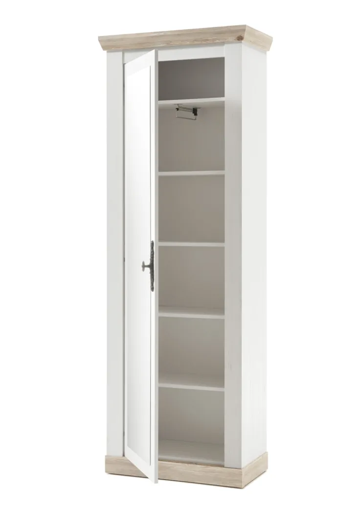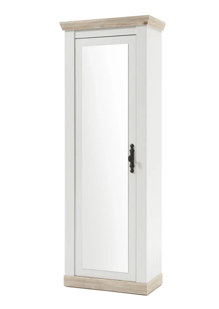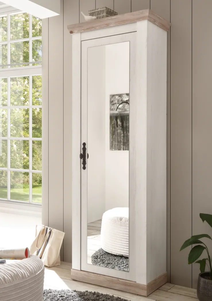 Bei dem attraktiven Kleinmöbel FLORENZ handelt es sich um einen reizenden Garderobenschrank, der inklusive aufgesetztem Spiegel ins Haus kommt. Der Korpus und die Front bestehen aus Pinienholz und sind weiß. Applikationen in Pinie-Oslo-Dekor sorgen für zusätzlichem Charme. Hinter der Drehtür, die mit einem schwarzen Metallgriff geöffnet werden kann, befinden sich eine Kleiderstange und sechs Fächer. Das Modell ist 38 cm tief und besteht aus Holznachbildung.