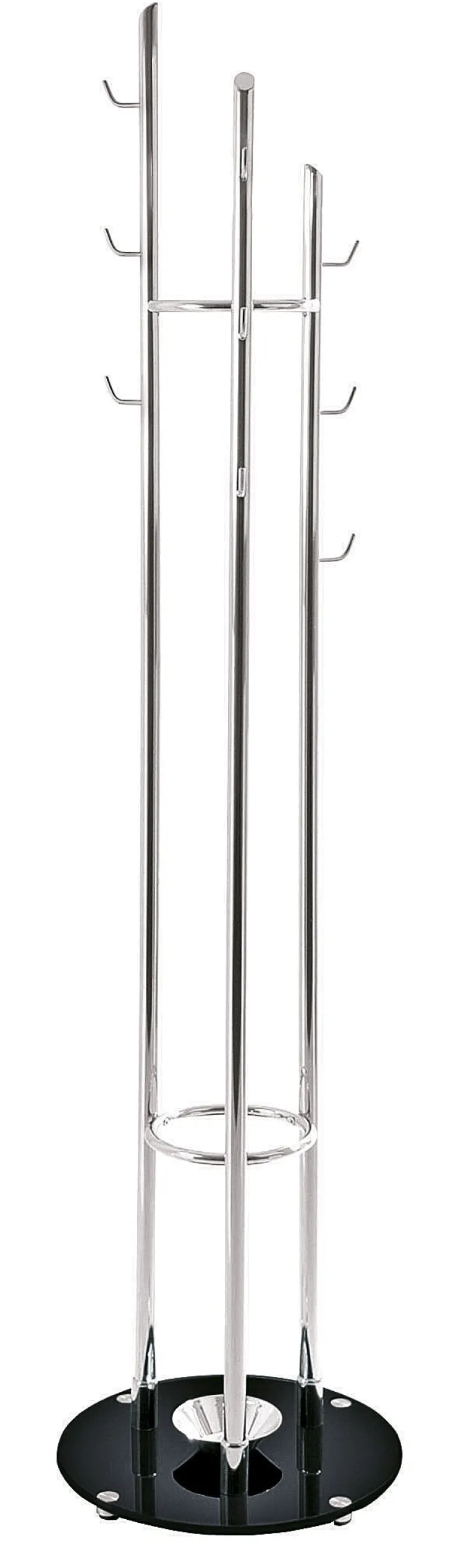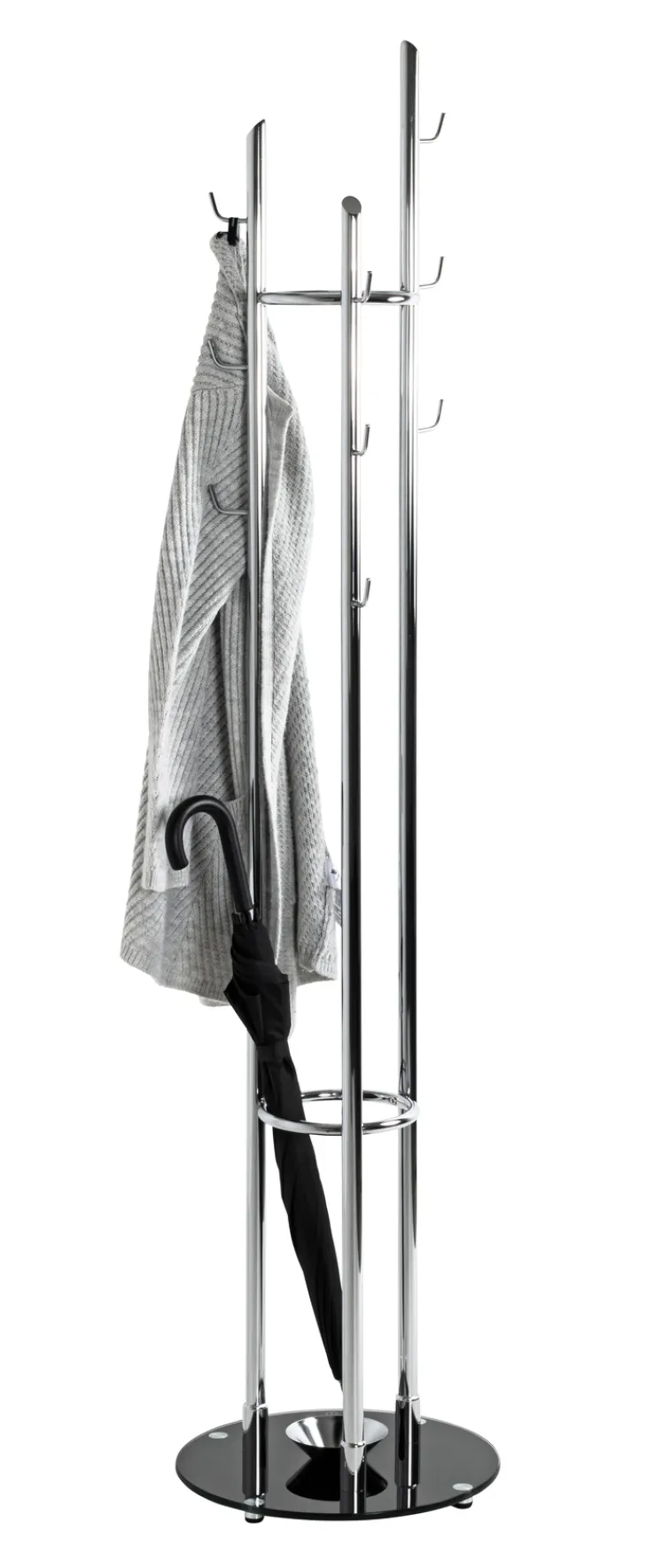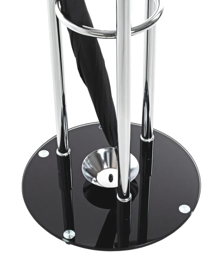 Dieser Garderobenständer besticht durch seine moderne und elegante Optik. Die Kombination aus glänzendem Chrom und tiefem Schwarz verleiht ihm eine zeitlose Eleganz, die sich nahtlos in verschiedene Einrichtungsstile einfügt – von minimalistisch bis modern-industriell.Das Schwarz bildet einen stilvollen Kontrast zum Chrom und verleiht dem Garderobenständer eine gewisse Erdung und Stabilität.