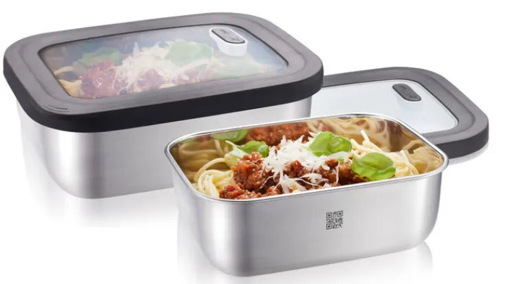 Das Frischhaltedosen-Set PROVIDO ist ein 2-teiliges Modell der Marke GEFU und wird aus solidem sowie rostfreiem Edelstahl gefertigt. Deckel können zu den Dosen auf Wunsch separat hinzubestellt werden. Die Dosen eignen sich zur Aufbewahrung von Speiseresten und lassen sich für die Zubereitung eines Pausensnacks im Job verwenden. Ganz gleich, ob warme oder kalte Speisen in den Frischhaltedosen gelagert werden: Sie erhalten die Aromen für lange Zeit.