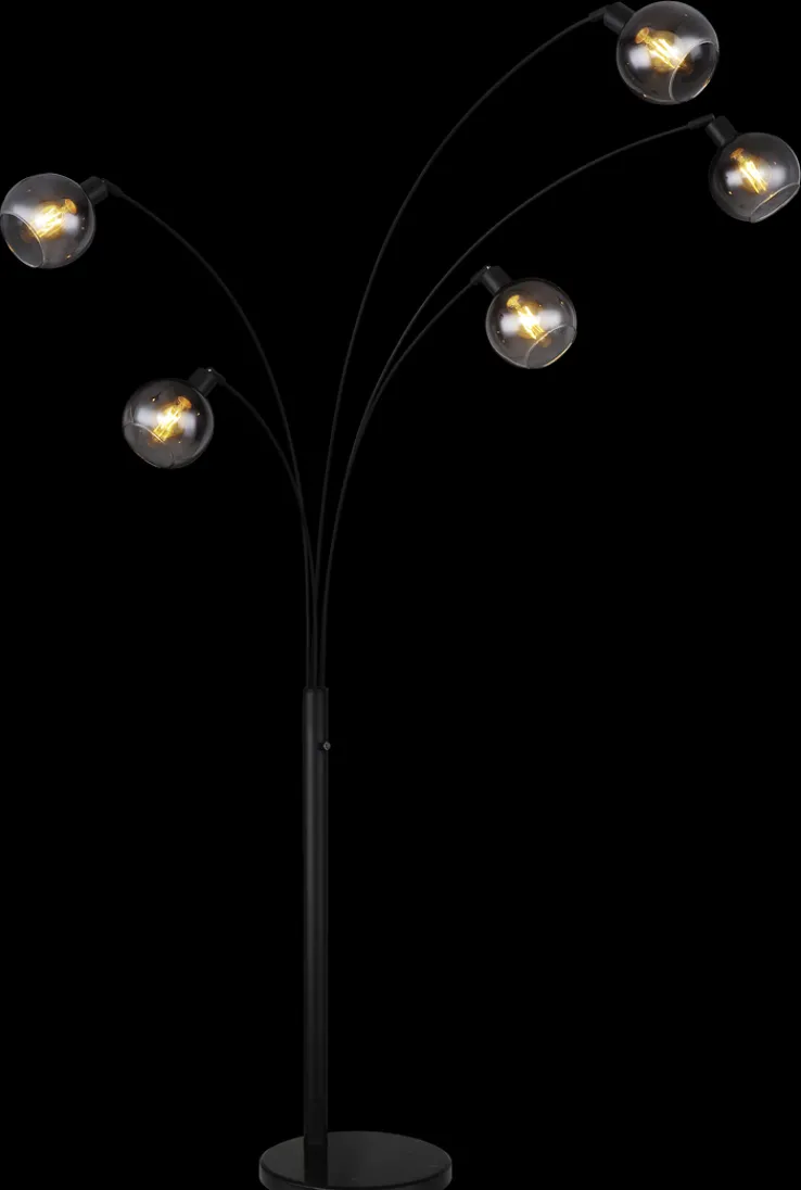 Die Bogenlampe SEYMOUR von Globo vereint modernes Design mit funktionaler Beleuchtung. Mit einer Höhe von 208 cm und einer Breite von 110 cm bietet sie eine beeindruckende Präsenz in jedem Raum. Die Lampe verfügt über fünf Brennstellen, die mit E27-Fassungen ausgestattet sind, und unterstützt sowohl AGL- als auch Retrofit-Leuchtmittel, die jedoch nicht im Lieferumfang enthalten sind. Der Energieverbrauch beträgt maximal 200 W, was eine effiziente Beleuchtung gewährleistet. Das Design der Lampe zeichnet sich durch ihre runden, rauchfarbenen Glaskugeln aus, die auf eleganten, schwarzen Metallarmen montiert sind. Diese Kombination verleiht der Lampe einen industriellen und skandinavischen Stil, der sich nahtlos in verschiedene Einrichtungsstile einfügt. Der stabile Tellerfuß aus schwarzem Marmor sorgt für sicheren Stand und unterstreicht die hochwertige Verarbeitung. Die Schutzklasse 2 und die Schutzart IP20 bieten zusätzlichen Schutz und Sicherheit. Ein Ein-/Ausschalter ist integriert, um die Bedienung zu erleichtern.