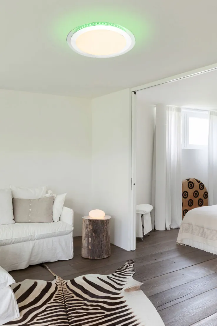 Die Deckenleuchte NICOLE II hat einen Durchmesser von 40 cm, ist aus Kunststoff gefertigt und wird mit eingebauten LED geliefert, welche den Farbwechsel möglich machen. Durch ihre Leistung von maximal 2400 lm sorgt sie in jedem Raum für eine ausreichende Beleuchtung. Die maximale Farbtemperatur der LED liegt dadurch bei 3000-6000 K. Dabei können Sie zwischen den Farben Grün, Rot und Blau wählen und diese je nach Bedarf einstellen und anpassen. Die Deckenlampe besticht mit ihrem kreisförmigen, zeitlosen Design und lässt sich durch ihre einfache Bedienung in jeden modernen Haushalt integrieren. Lassen Sie sich von der NICOLE II von GLOBO überzeugen und von den individuellen Möglichkeiten dieser Deckenleuchte inspirieren!