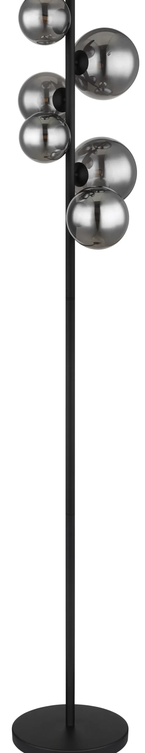 Die LED Retrofit Stehlampe RIHA von GLOBO hat ein dekoratives Design. Schirme aus rauchig grauem Glas befinden sich im oberen Bereich einer schwarzen Metallstange. Die Stehleuchte hat eine Höhe von 155 cm.