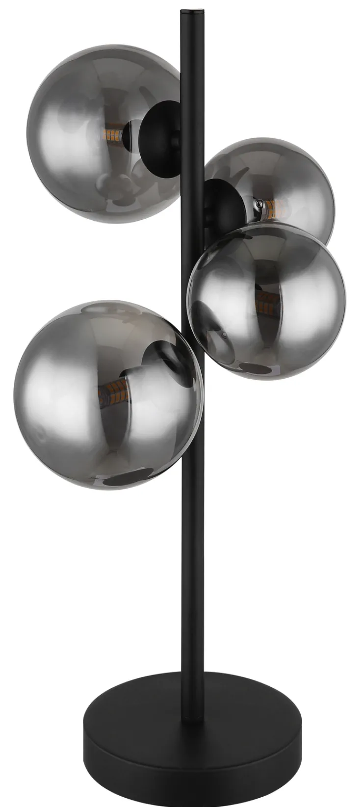 Der Schirmdurchmesser liegt bei 10 beziehungsweise 12 cm. Die Lampe ist 18 cm tief und 30 cm breit. Sie zeigt graues Glas und schwarzes Metall. Ihre charmante Eleganz zieht immer wieder die Blicke auf sich. Die kugeligen Lampenschirme sind in Form einer kleinen Spirale an dem schwarzen Mittelstab angebracht. Dabei sind kleine und große Kugeln abwechselnd angebracht. Der stabile runde Fuß in Schwarz nimmt auf dem jeweiligen Tisch nur wenig Platz weg.
