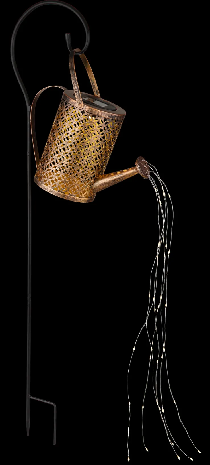 Diese Solarlampe beeindruckt mit ihrem kreativen Design: Am oberen Ende des 85 cm langen Erdspießes befindet sich eine goldfarbige Gießkanne, der LED-Streifen entspringen. Schick und funktional!