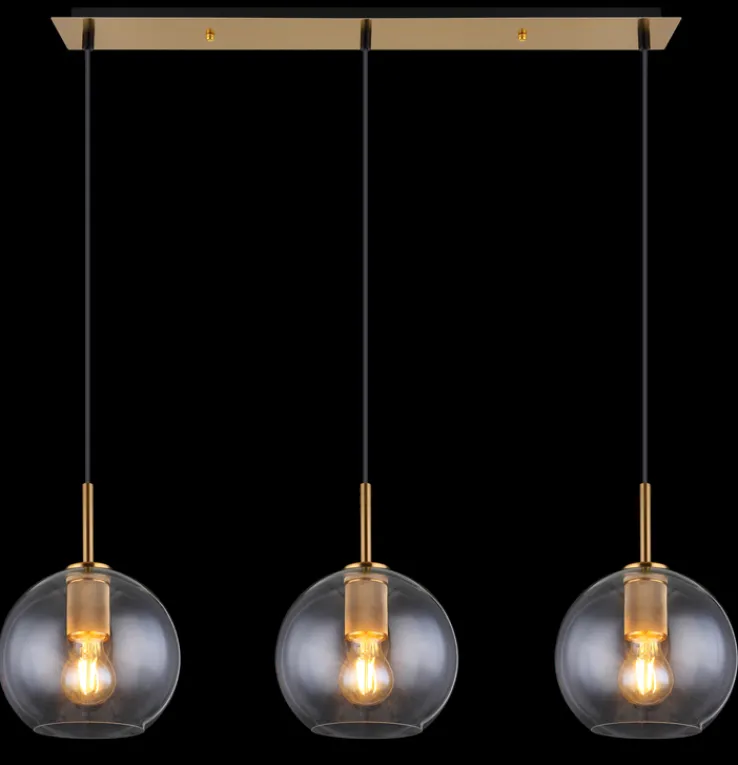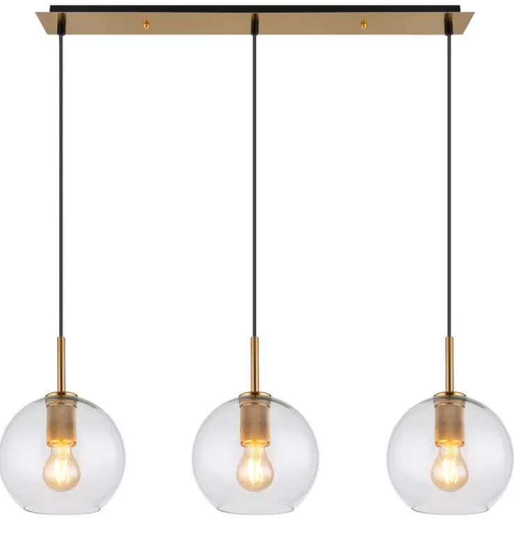 Die dreiflammige Hängeleuchte ADARA kombiniert einen messingfarbigen Metallbalken mit kugelförmigen Lampenschirmen aus Klarglas. Als Balkenpendel eignet sich diese Deckenleuchte zum Beispiel für den Wohn- oder Esszimmertisch.