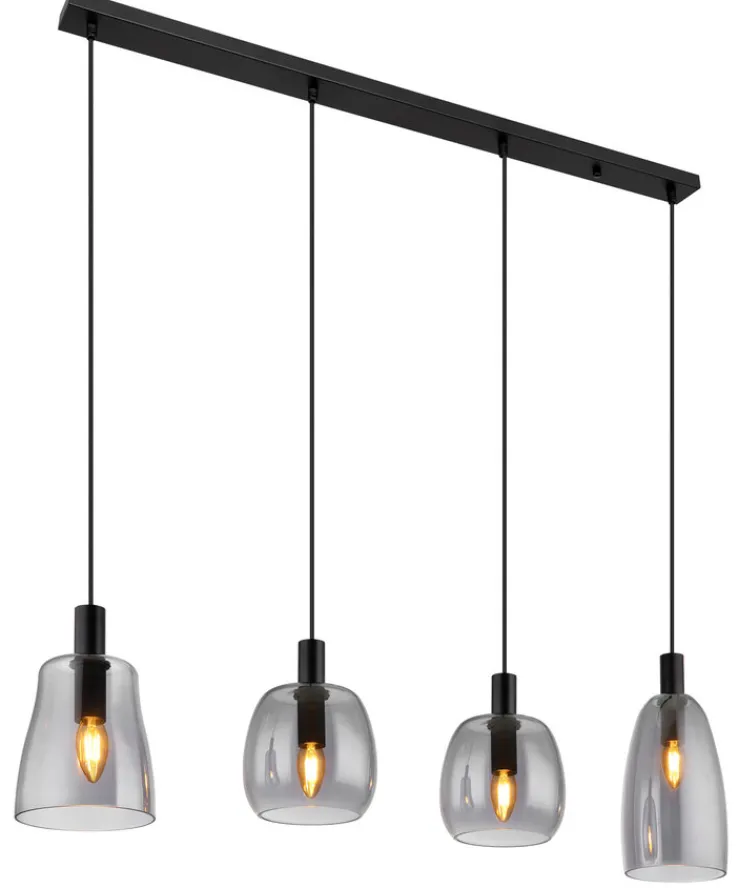 Bei der Pendellampe GARRI von GLOBO hängen vier schwarze, höheneinstellbare Pendel an einer schwarzen Leiste. An jedem Pendel sind eine schwarze Lampenfassung sowie ein Schirm aus rauchfarbig grauem Glas befestigt. Dabei weisen die Glasschirme drei verschiedene Formen auf. In die E27 Retrofit Fassungen können unterschiedliche Leuchtmittel mit bis zu 40 Watt (insgesamt maximal 160 Watt) eingeschraubt werden, die dank des rauchfarbigen Glases ein leicht gedämpftes Licht ausstrahlen.