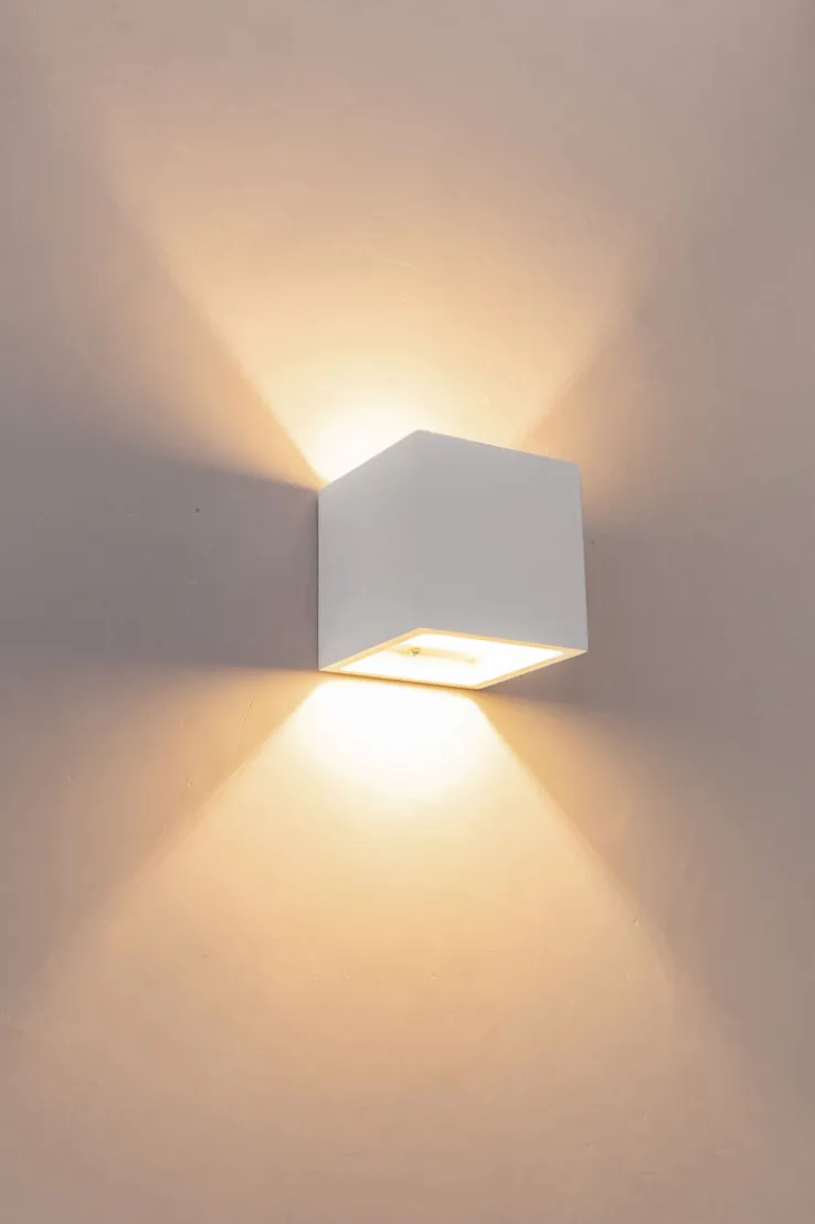 Das Up & Down Licht strahlt aus der würfelförmigen, weißen Wandleuchte CHRISTINE von GLOBO, die aus Gips gestaltet und optisch absolut unauffällig ist. Die Kanten des kleinen Würfels sind jeweils 11,5 Zentimeter lang.