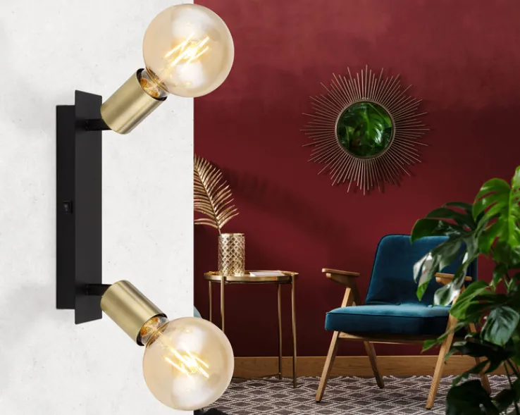 Die schwarz- und messingfarbige Retrofit Wandleuchte LILIANA mit 2 Spots präsentiert sich zeitlos elegant und passt in den modern eingerichteten Wohnbereich. Durch den besonderen Retro-Charme ist die 25 cm breite Leuchte ideal für die Wand im Wohn-, Ess- oder Schlafzimmer. Auch in einem Eingangsbereich kommt die dreh- und schwenkbare Wandleuchte mit eingebautem Ein- und Ausschalter gut zur Geltung und leuchtet verschiedene Bereiche punktuell aus.