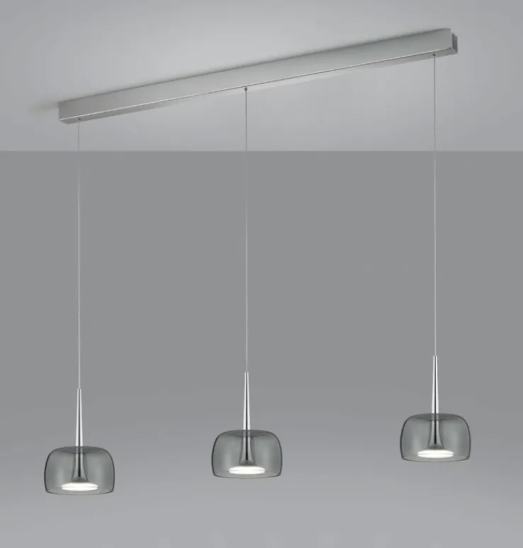 LED Balkenpendel FLUTE ist eine sehr moderne, chromfarbige und 110 cm breite Pendelleuchte. Die 3-flammige Lampe hat eine elegante Ausstrahlung und besteht aus Aluminium sowie Glas.
