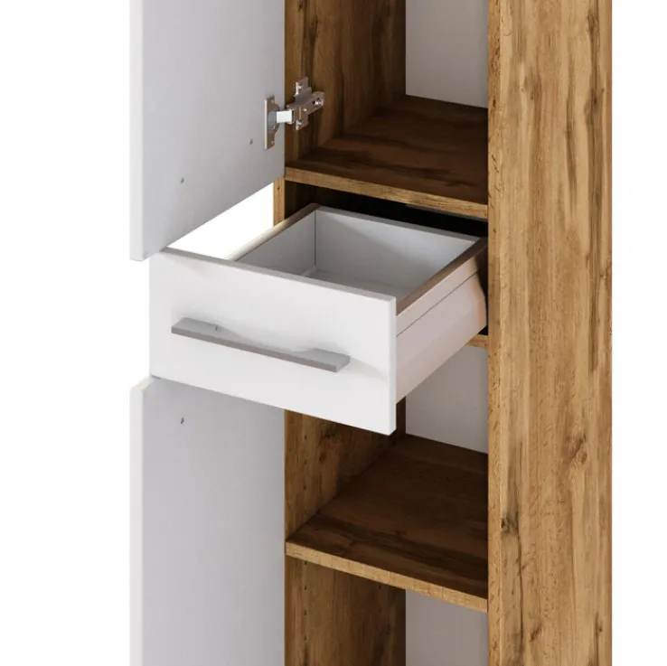 Der Hochschrank LIVORNO ist Teil der gleichnamigen Badmöbelserie, die in der schicken Farbkombination Wotan Eiche und Weiß gestaltet ist. Breite, silberfarbige Griffe ergänzen den zeitgemäßen Look. Der Schrank ist mit 2 Drehtüren ausgestattet, hinter denen sich 4 Einlegeböden verbergen. Eine Schublade macht das Raumangebot komplett.