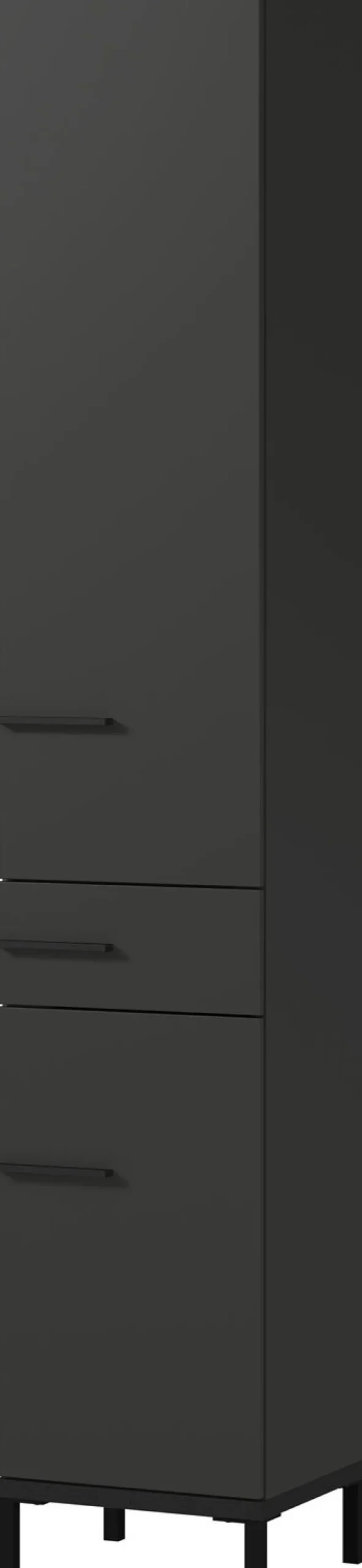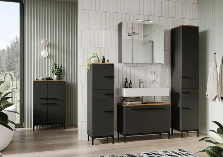 Der Hochschrank YONKERS in den Farben Graphit/ Navarra Eiche misst 34 x 190 cm. Er verleiht dem Badezimmer mit seinem modernen Look ein stylisches Ambiente und bietet zugleich viel Platz für Pflegeprodukte, Handtücher und vieles mehr.