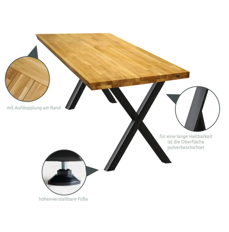 Mit dem Esstisch in Eiche massiv beweist der deutsche Hersteller „holz4home“ einmal mehr, wie ein Qualitätsprodukt aussieht. Die Tischplatte verfügt über eine 40 Millimeter dicke Aufdopplung, die für eine hohe Belastbarkeit sorgt. In Verbindung mit dem schwarzen, pulverbeschichteten Stahlgestell im X-Design kommt das Holz einen modernen Industrie-Stil, der sich geschmackvoll in jedes Einrichtungskonzept von rustikal bis hochmodern integrieren lässt. Dieser Esszimmertisch in Eiche massiv von holz4home verwandelt Essbereiche in eine ansprechende Wohlfühloase.