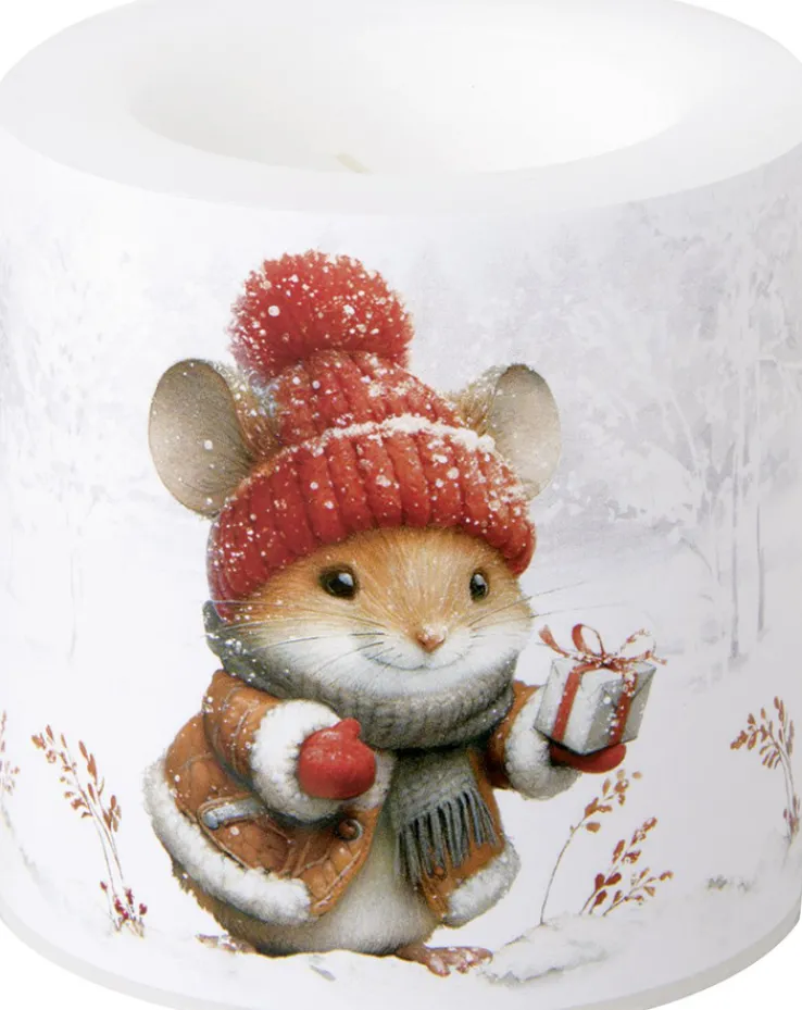 Dieses Windlicht aus der Serie ELLI AND BECKY ist aus weißem Wachs gefertigt und misst 75 cm in Tiefe, Breite und Höhe. Das Design zeigt auf der Außenseite eine winterliche Szene mit einer detailreich gezeichneten Maus, die eine rote Strickmütze mit Bommel, einen Schal sowie eine braune Jacke mit weißem Fellbesatz trägt. Die Maus hält ein kleines Geschenk in der rechten Hand und trägt rote Fäustlinge. Im Hintergrund ist eine verschneite Landschaft in sanften Grautönen zu sehen. Das Windlicht kombiniert eine dezente weiße Grundfarbe mit einem freundlichen und saisonalen Motiv, das insbesondere für winterliche und festliche Anlässe geeignet ist.