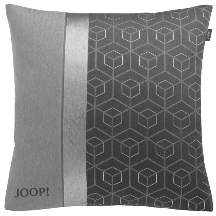 Das Material besteht zu 28 Prozent aus Baumwolle und zu 72 Prozent Polyester. Das hochwertige Gewebe kann vorsichtig bei 30 Grad gewaschen werden. Sehr schön ist auch die Wendeoptik der Hülle. So finden Sie einerseits eine rein graue und sehr edle Fläche; auf der anderen ist nicht weniger edel ein schönes Design zu erkennen: Auf der einen Hälfte der Fläche ist ein etwas breiter hellgrauer Streifen zu sehen. Ein ganz schmaler Streifen in Dunkelgrau trennt ihn von einem breiteren in Satinoptik. Dieser glänzt und schimmert im Licht und hebt die Qualität der Hülle besonders hervor. Mehr als die Hälfte des Designs gehört aber einer gemusterten Fläche. Die Grundfarbe ist dasselbe Dunkelgrau wie bei der Wendeseite. Darauf zeigen sich in einem Silbergrau Sechsecke und darüber liegende dreidimensionale Würfelkanten. Die JOOP! Kissenhülle METRIC kann viele Plätze schmücken, ob Bett oder Lieblingssessel. Und sie kann, mit einem passenden Kissen gefüllt, als Geschenk dienen.