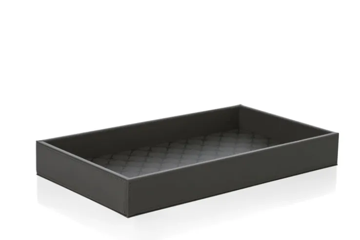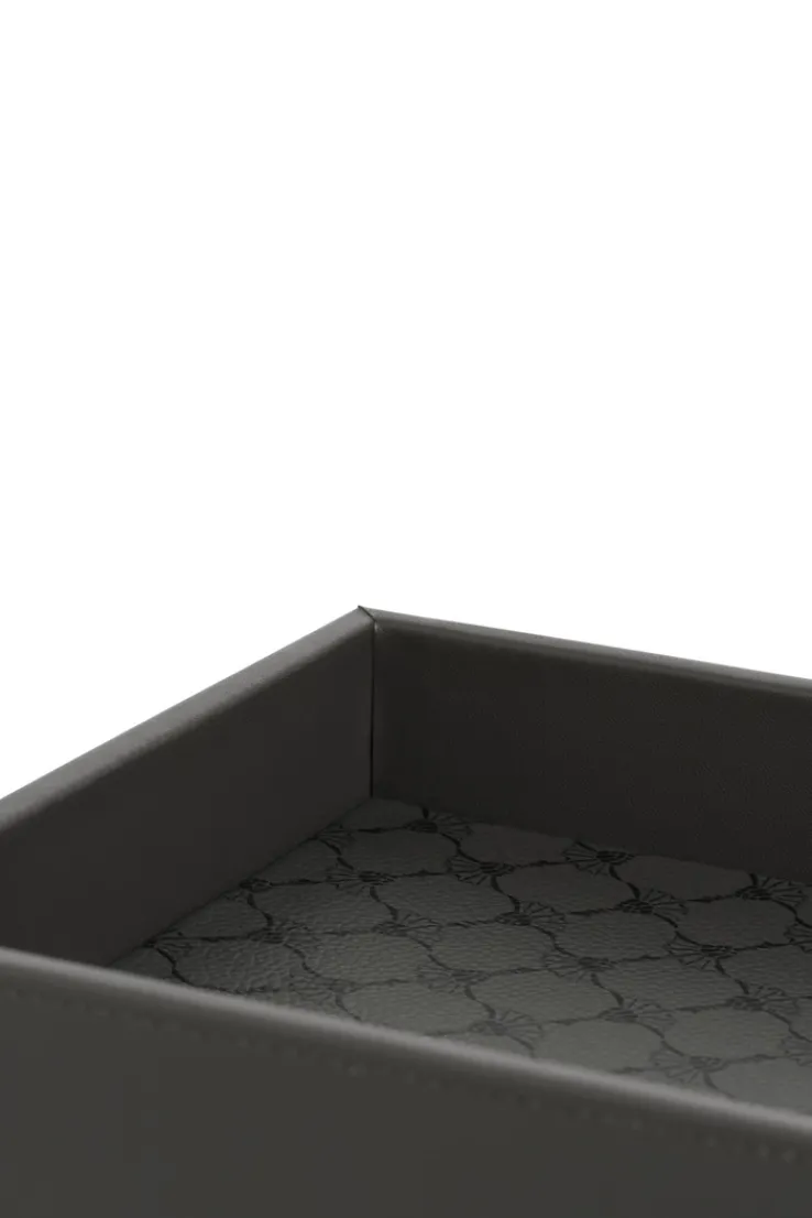 Die Farben anthrazit-schwarzen Farbton verleihen dem Tablett ein modernes und zeitloses Erscheinungsbild. Die Oberfläche besteht aus hochwertigem Kunstleder mit sichtbaren, gleichmäßigen Nähten entlang der Kanten. Im Inneren ist ein dezentes, grafisches Muster erkennbar, das für einen optischen Akzent sorgt.