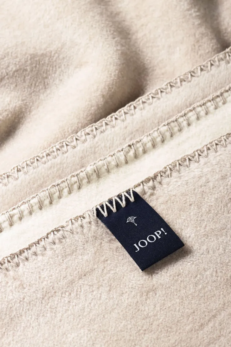 Die Wohndecke der Serie UNI DOUBLEFACE präsentiert sich in einem dezenten Beigeton mit ecrufarbenem Akzent und ist mit einer sichtbaren Kettelnaht eingefasst. Das Design ist einfarbig gehalten, auf einer Seite mit einem klaren JOOP!-Schriftzug, der sich kontrastierend vom Hintergrund abhebt. Die Oberfläche wirkt samtig und weich, was auf die Materialzusammensetzung aus 58 % Baumwolle, 35 % Polyacryl und 7 % Polyester zurückzuführen ist. Durch das Mischgewebe entsteht eine angenehme Haptik und ein gleichmäßiges Erscheinungsbild.