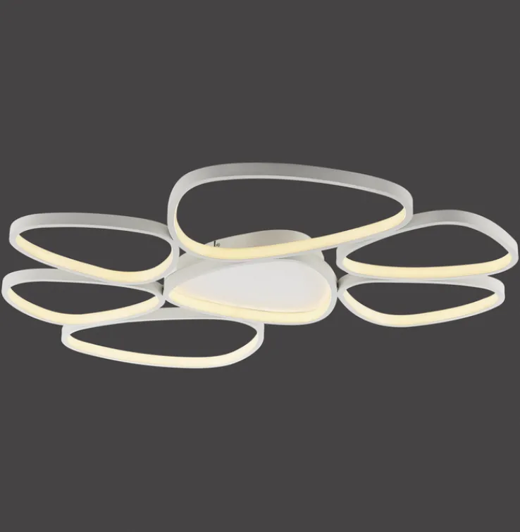 Der weißfarbige Korpus der 92 cm breiten und 70 cm tiefen LED Deckenlampe PEBBLES besteht aus Metall, während der weißfarbige Schirm aus Metall und Kunststoff besteht. Als besonderes Feature ist die Deckenlampe 3-fach dimmbar.