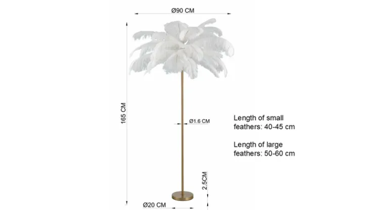 Mit einer Höhe von 165 cm und einer Breite von 65 cm ist sie ein auffälliges Element in jedem Raum. Die Leuchte besticht durch ihre goldfarbene Metallstruktur aus Stahl, die in Kombination mit den weißen, federartigen Elementen aus 100% Tierhaar eine luxuriöse Atmosphäre schafft. Diese Kombination aus Materialien verleiht der Leuchte eine besondere Textur und einen Hauch von Exklusivität.
