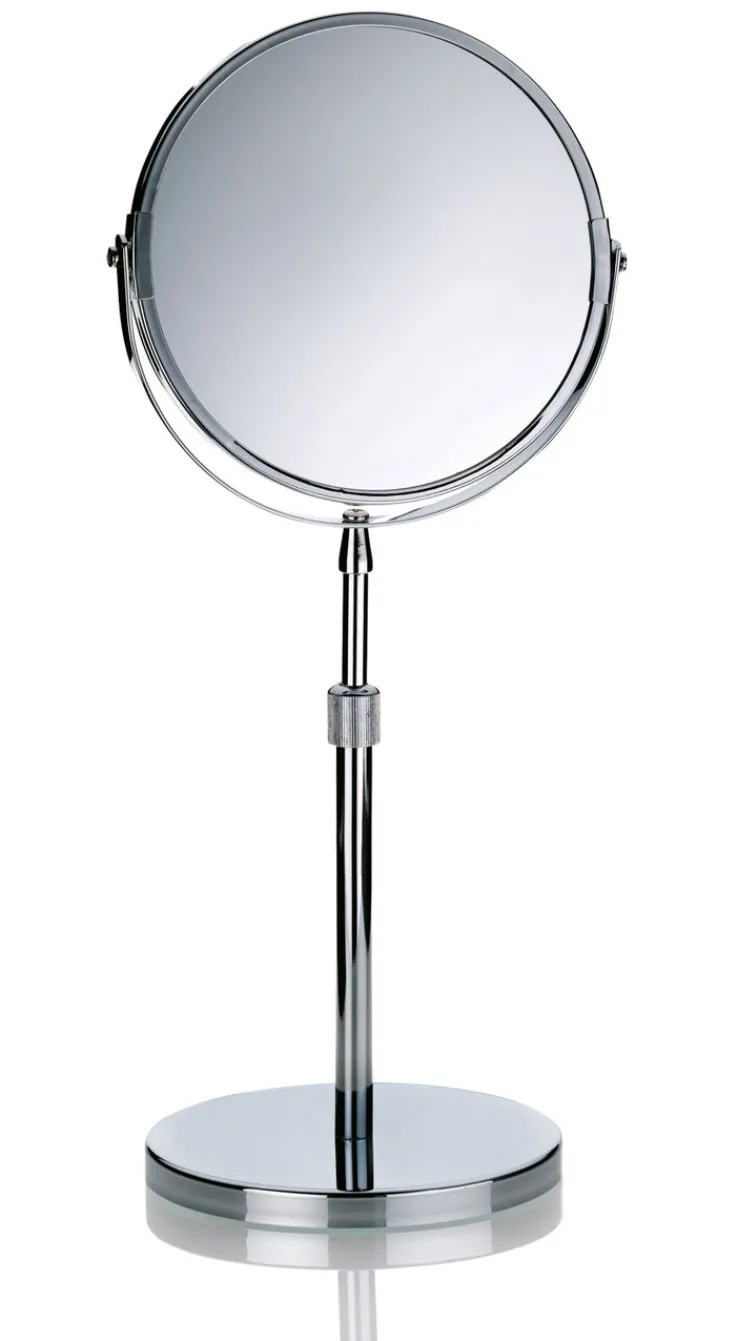Der Standspiegel SILVANA verfügt über einen stabilen Rahmen, der aus solidem Metall gefertigt ist. In den Standfuß ist eine praktische Höhenverstellung integriert, mit der sich eine Gesamthöhe von max. 38 cm erreichen lässt. Der kreisrunde Spiegel aus modernem Spiegelglas ist in eine schlichte Halterung eingefasst, die farblich perfekt auf den Standfuß angepasst ist und das flexible Drehen der Spiegelfläche in verschiedene Richtungen erlaubt. Damit eignet sich dieses Spiegelmodell perfekt als funktionaler Schminkspiegel auf einer Anrichte, im Badezimmer oder am Schminktisch. Die silberfarbigen Oberflächen des Standspiegels SILVANA lassen sich jederzeit unkompliziert reinigen und fügen sich in verschiedene Möbeldesigns und Raumfarben universell ein. #porta #portamöbel #glamitup