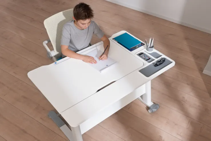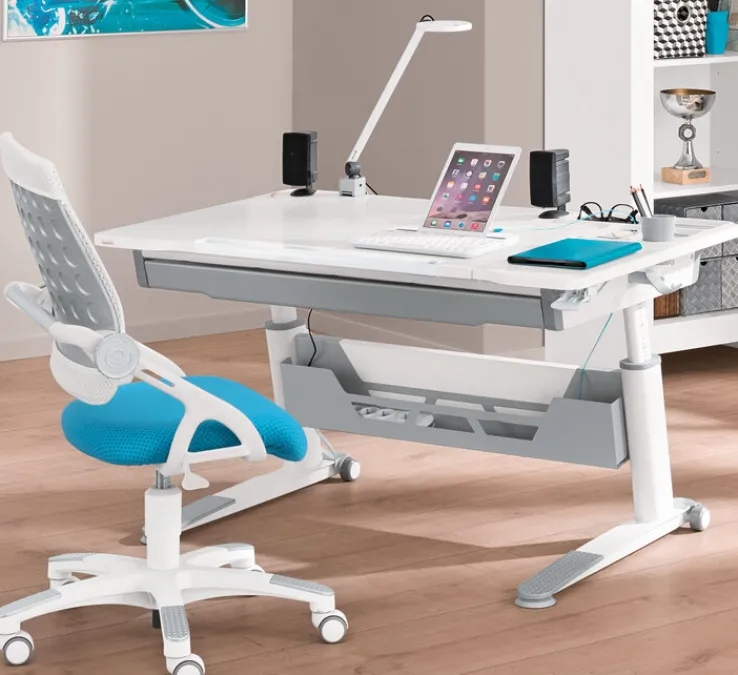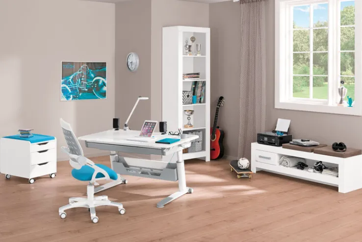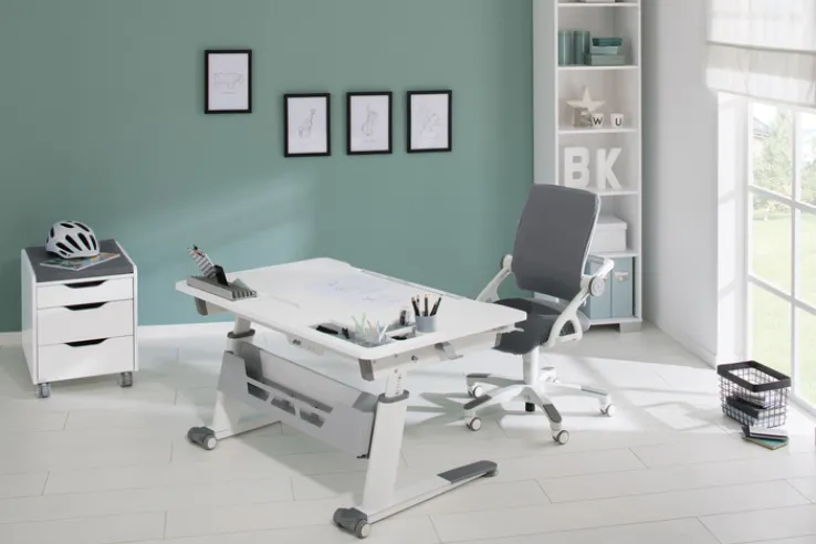 Der moderne Schreibtisch JARO von PAIDI im attraktiven Farbton kreideweiß überzeugt durch sein stilvolles Design und ist eine praktische Ergänzung für das geschmackvoll eingerichtete Kinder- oder Jugendzimmer. Kombiniert mit einem hochwertigen Bürostuhl aus der Möbelserie entsteht ein elegantes Ensemble. Die Tischplatte und die Ablage bieten viel Platz und zusätzlichen Stauraum. Der Schreibtisch ist individuell höhenverstellbar und mit jeweils zwei Möbelrollen an den Füßen einfach umzustellen.
