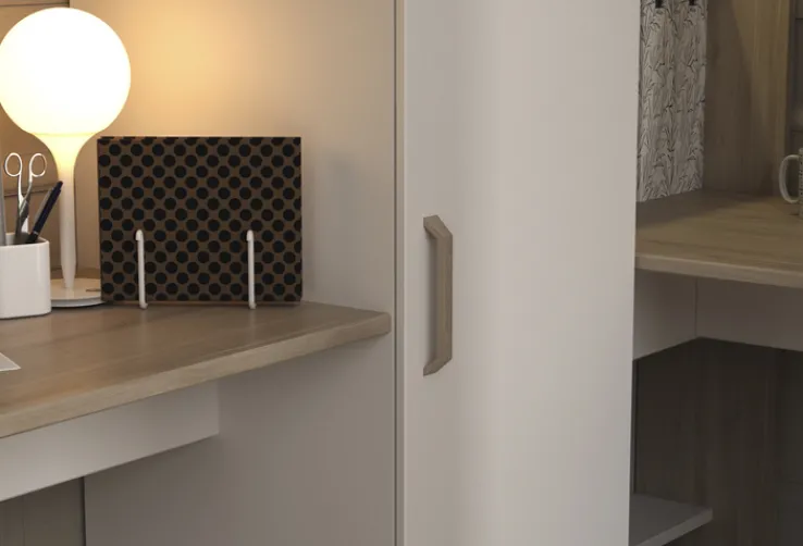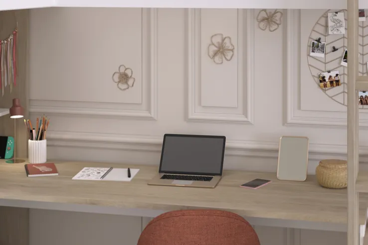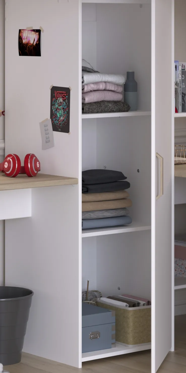 Unter den Liegeflächen befindet sich ein Mehrzweckschrank mit Drehtür und Einlegeböden. Zudem verfügt das Ensemble über zwei integrierte Schreibtische, die seitlich von praktischen Ablageflächen für Bücher, Spielzeug oder Schulmaterial ergänzt werden. Gefertigt aus einer robusten Holznachbildung in den Farben Braun und Weiß, zeichnet sich das Hochbett durch seine strapazierfähige und pflegeleichte Oberfläche aus.