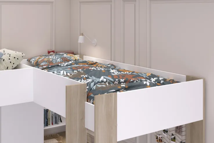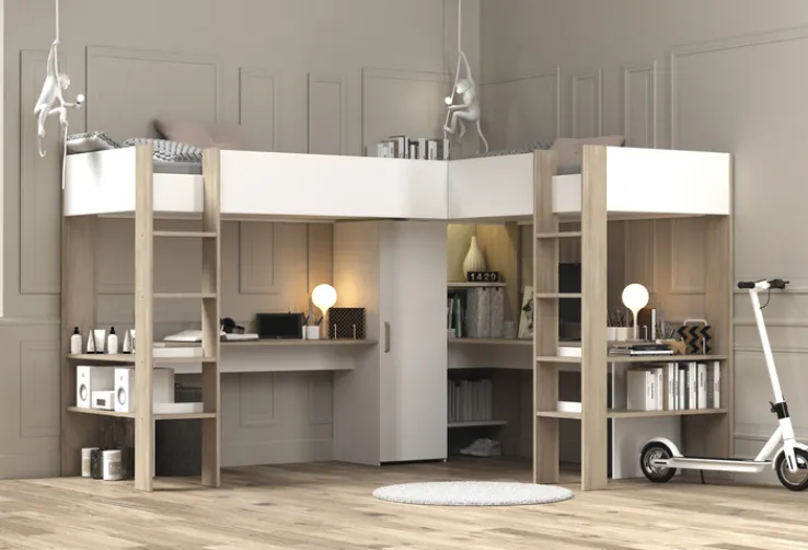 Das Parisot Eck-Hochbett ALEX braun/ weiß bietet zwei über Eck liegende Schlafplätze in der Größe 90 x 200 cm. Die Schenkellängen betragen 295 cm und 231 cm, bei einer Gesamthöhe von 180 cm. Beide Schlafplätze sind über eine Leiter erreichbar, und die erhöhten Bettseitenwände sorgen für zusätzliche Sicherheit während des Schlafs.
