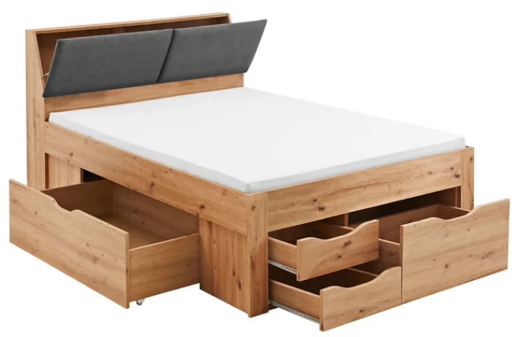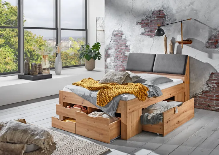 Hergestellt aus solider Holznachbildung ist das 146 x 104 x 238 cm große Stauraumbett MAXI stabil und strapazierfähig. Es besticht auf den ersten Blick mit einer warmen Holzfarbe und einem auffällig gestalteten Kopfteil, in dem sich wertvoller Stauraum versteckt. Unter der Liegefläche mit Rollrost aus Buche bietet das Bett in fünf Bettschubkästen jede Menge Platz zur Aufbewahrung von Kissen, Decken und vielem mehr.