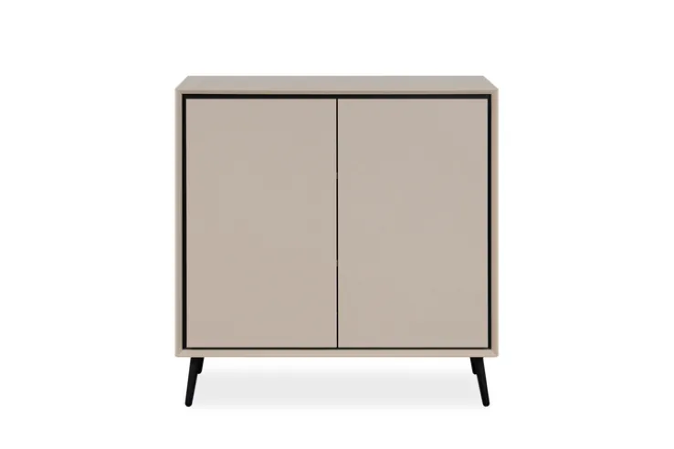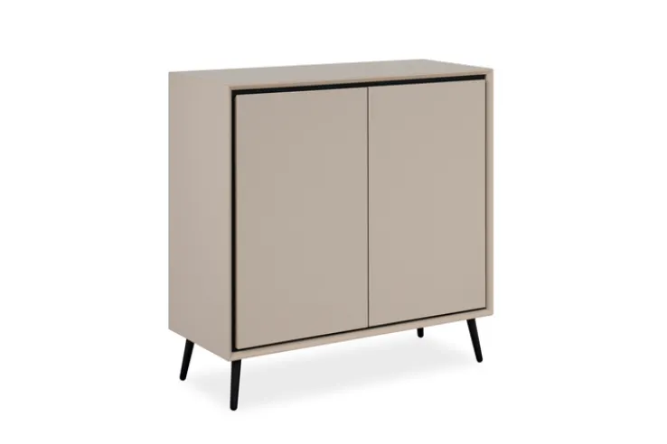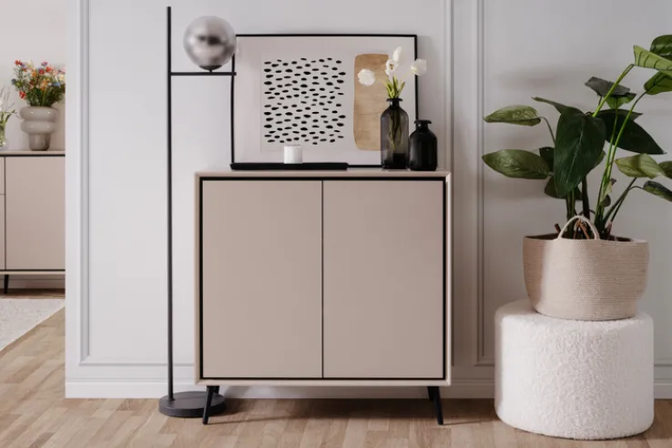 Die Hauptfarbe Beige, kombiniert mit schwarzen Akzenten, verleiht der Kommode eine elegante und zeitlose Optik. Die sandfarbene Oberfläche ist melaminbeschichtet, was für eine pflegeleichte und langlebige Nutzung sorgt.