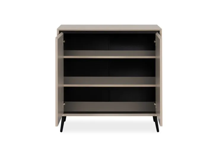 Die Kommode verfügt über zwei Drehtüren und zwei Einlegeböden, die praktischen Stauraum für diverse Gegenstände bieten. Die grifflosen Türen sind mit einer Soft-Close-Funktion ausgestattet, die ein sanftes und geräuschloses Schließen ermöglicht. Das Material besteht aus einer Holznachbildung und Kunststoff, was die Kommode robust und stabil macht. Mit einer maximalen Belastbarkeit von 20 kg eignet sie sich hervorragend für den täglichen Gebrauch in verschiedenen Wohnbereichen.