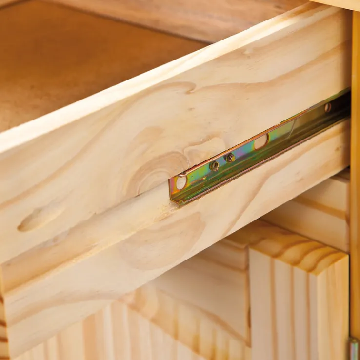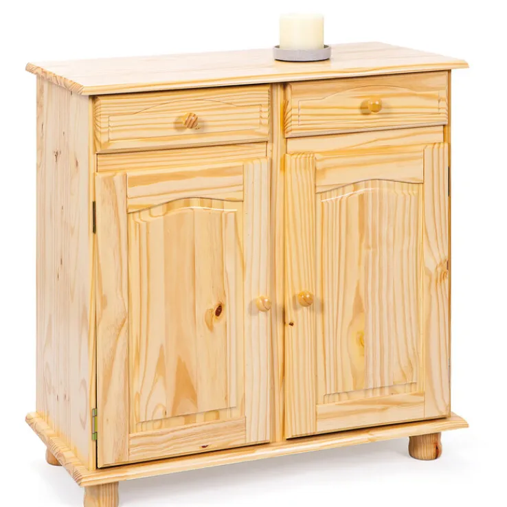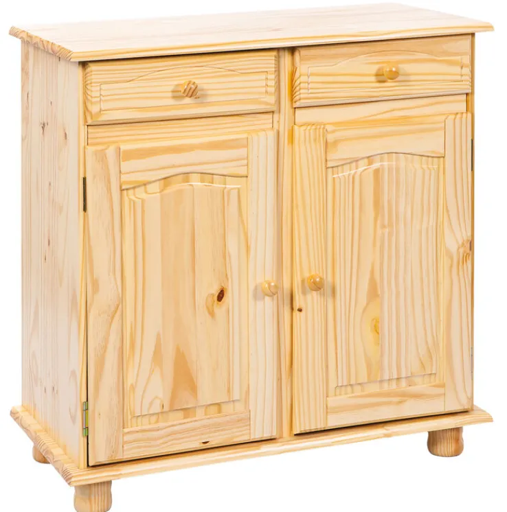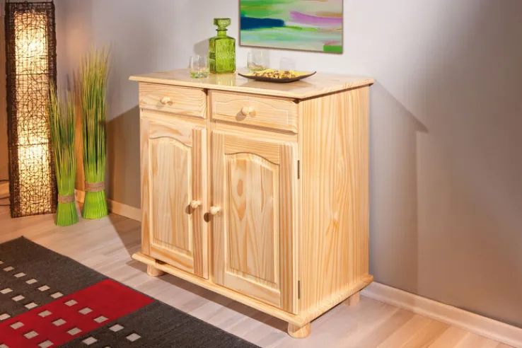 Das ebenso dekorative wie praktische Möbelstück ist mit zwei Drehtüren, hinter denen sich ein Einlegeboden befindet, sowie zwei Schubkästen ausgestattet. Die runden Griffe bestehen ebenfalls aus Massivholz und die gedrechselten Kugelfüße runden die hochwertige Verarbeitung der Kommode BENJAMIN ab. Sie lässt sich in allen Wohnräumen oder im Flurbereich praktisch nutzen und bietet ausreichend Stauraum, zum Beispiel für Geschirr, Spiele, Wäschestücke oder weitere Gegenstände des täglichen Bedarfs.