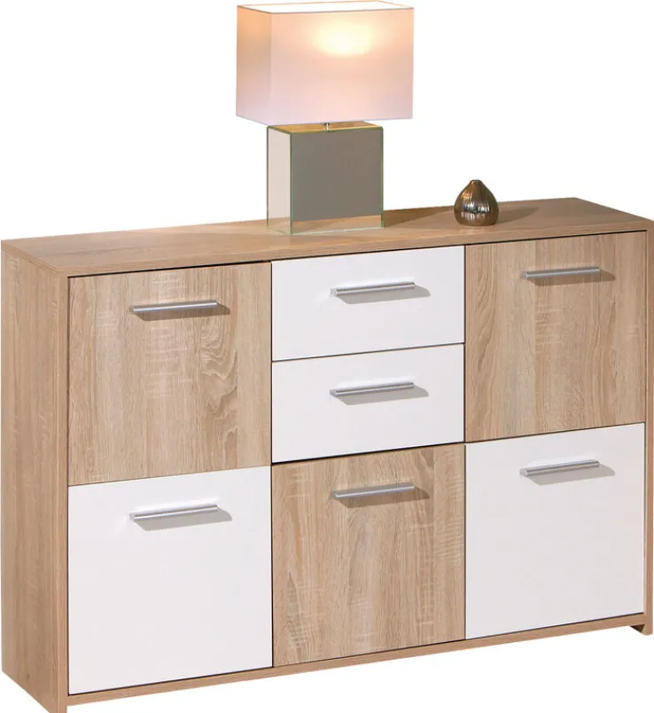 Die Kommode MAXIM in Eiche Sonoma Dekor und Weiß misst 115 x 77 x 30 cm. Sie verleiht dem Wohnraum mit ihrem stylischen Design eine moderne und gemütliche Atmosphäre und bietet zudem viel Stauraum.