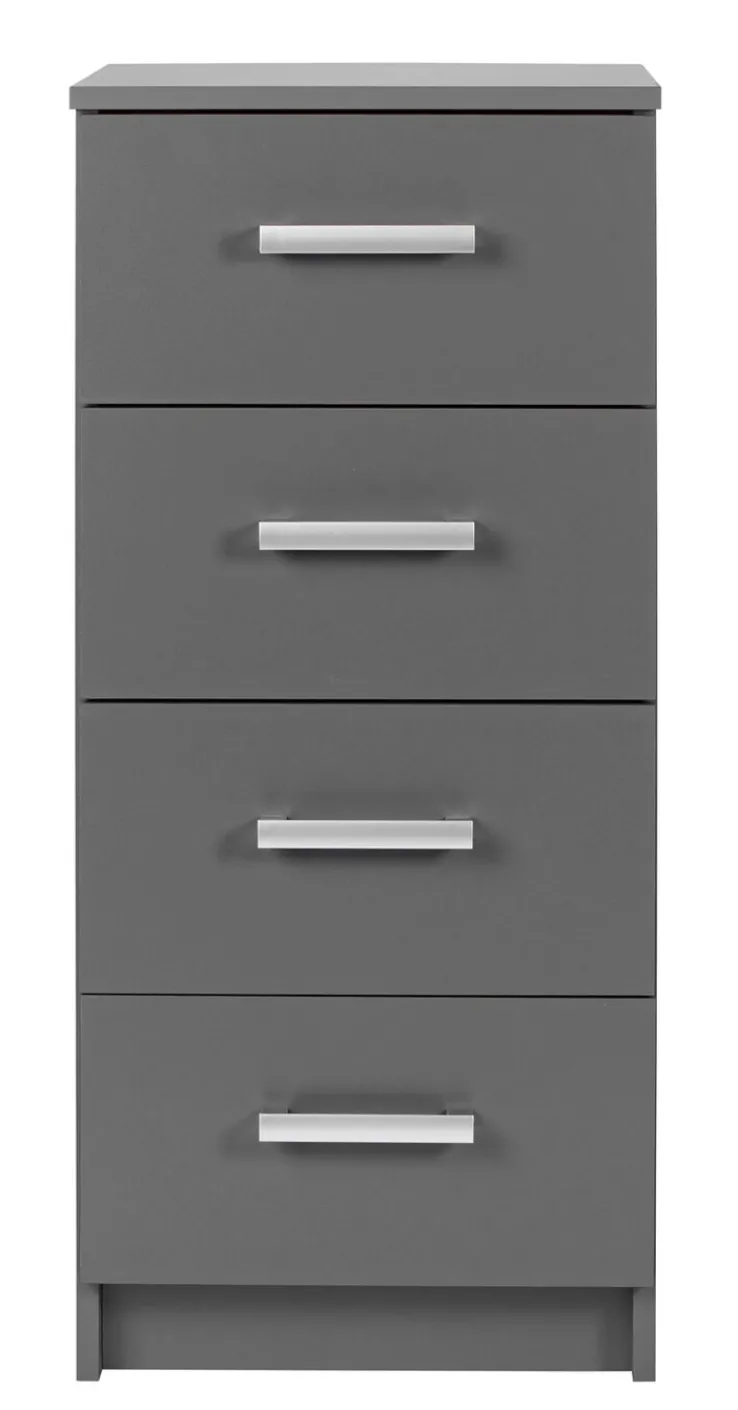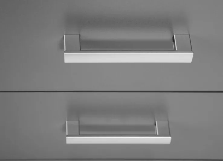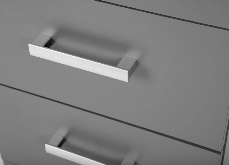 Die ROBERT 4 ist in einem attraktiven Mittelgrau gehalten. Sie passt hervorragend in modern eingerichtete Wohnungen. Vor allem im Arbeitszimmer ist die Kommode ein echter Allrounder. Stifte, Büroutensilien, Tablets und Papier verschwinden in den leichtgängigen Schubkästen mit großen silberfarbenen Griffen und das Arbeitszimmer sieht immer ordentlich du aufgeräumt aus. Aber auch im Flur, in Hobbyraum oder im Kinderzimmer überzeugt das Platzsparwunder in Optik und Funktion.