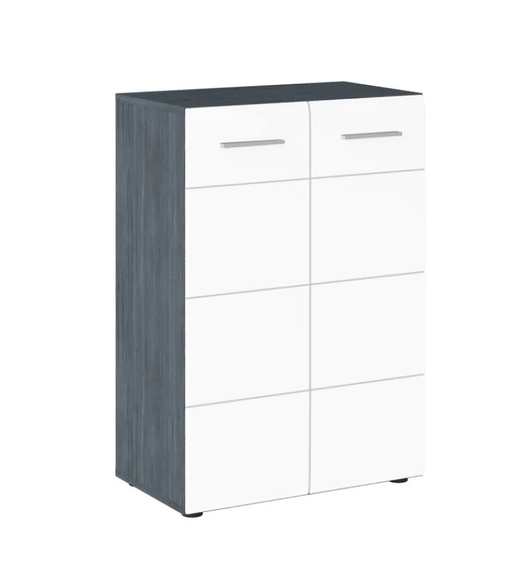 Die zwei Drehtüren sind mit Griffen ausgestattet, die den Zugang zum Stauraum erleichtern. Die hochglänzende Front in Weiß kontrastiert harmonisch mit den matten grauen Seiten, was der Kommode einen stilvollen und zeitgemäßen Look verleiht.