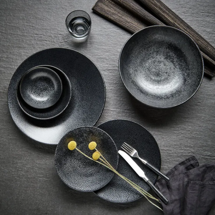 Der runde Teller ist mit seiner besonderen Optik bereits ohne Inhalt eine schicke Dekoration. Er kann in diesem Fall auf ein niedriges Sideboard oder oder auf einen Tisch gestellt werden. Sehr attraktiv wirkt er mit buntem Obst, dessen Farben einen wunderbaren Kontrast zu dem tiefen Schwarz abgeben. In diesem Sinne lassen sich auch andere helle Speisen wie Gemüse darauf anrichten und servieren. Ebenso steht er für Fleisch zur Verfügung.