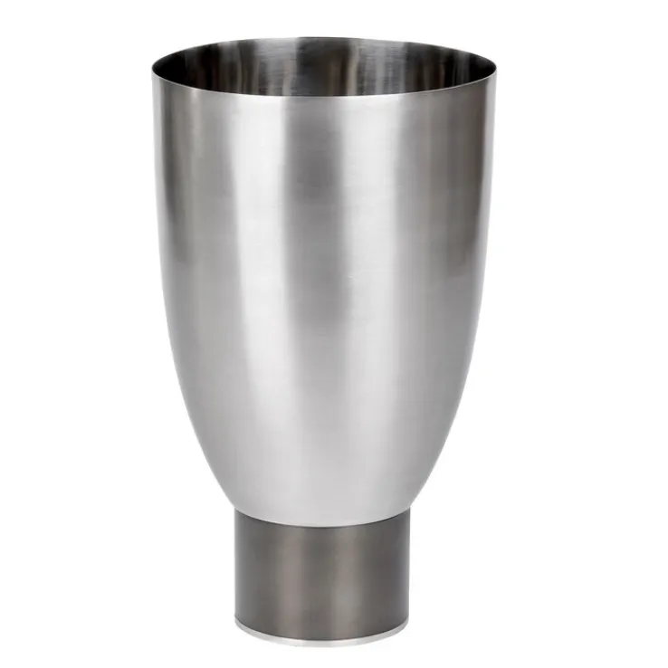 Die konisch geformte Vase mit Fuß ist aus rostfreiem Edelstahl gefertigt. Die schönen Oberflächen sind satiniert und haben einen matten Glanz. Zum Reinigen der Vase für den Innenbereich ist ein feuchtes Tuch ausreichend.