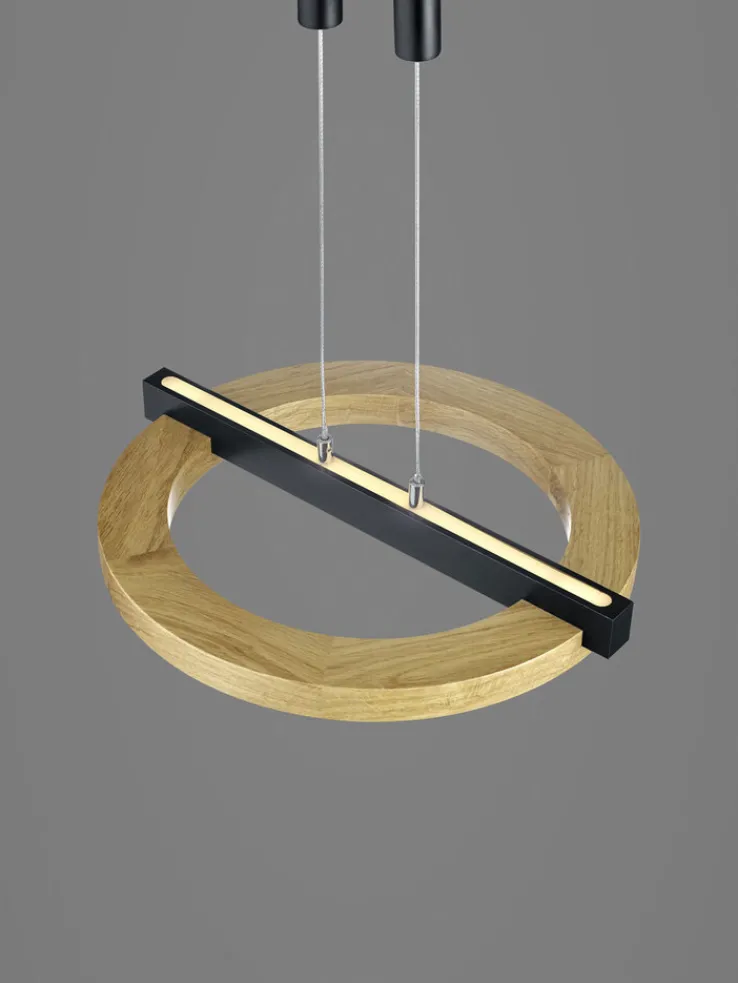 Die LED-Balkenpendelleuchte der Serie NELLA vereint modernes Design mit funktionaler Beleuchtung. Die Leuchte besteht aus einer Kombination von Holz und Metall, was ihr eine elegante und zeitgemäße Optik verleiht. Die Hauptfarben Braun und Schwarz harmonieren perfekt und fügen sich nahtlos in verschiedene Einrichtungsstile ein. Die runden Leuchtelemente sind an einem schwarzen Balken befestigt, der die beiden Ringe stilvoll miteinander verbindet.