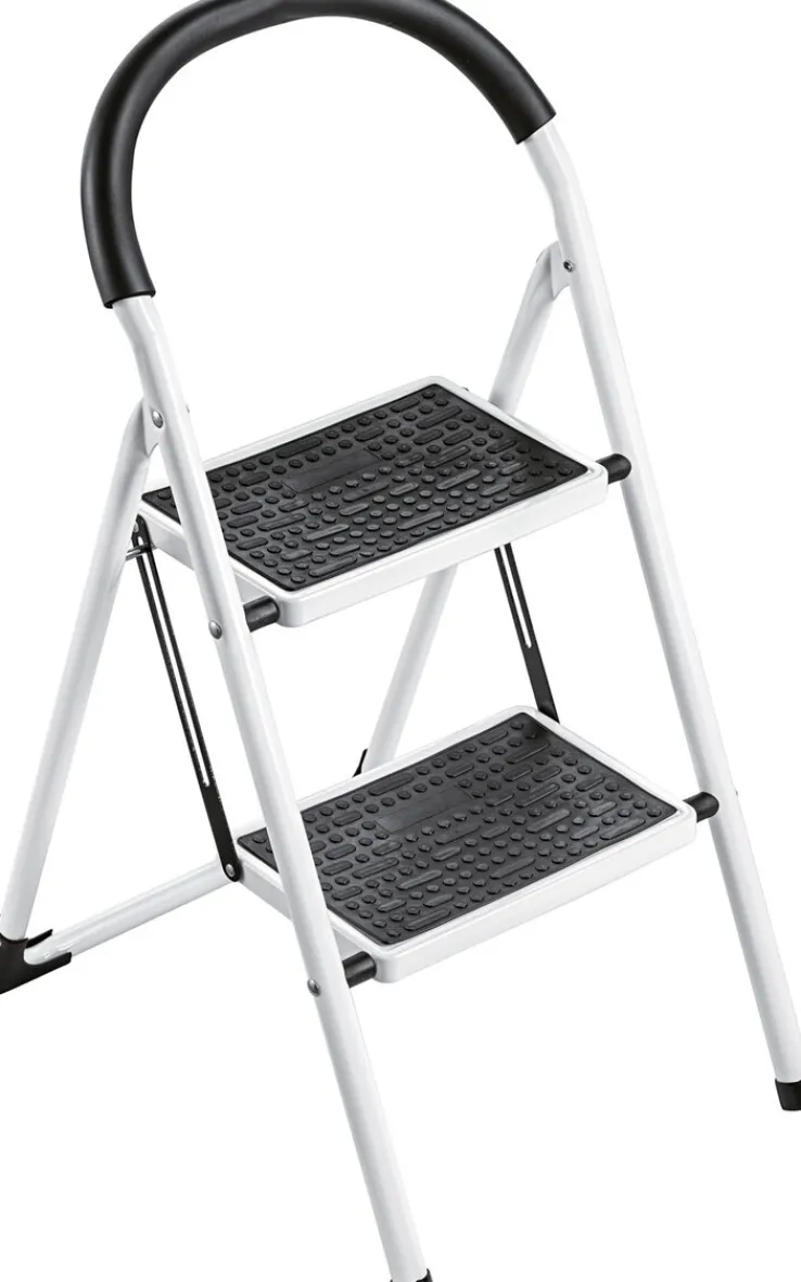 Die Leiter besitzt einen robusten Metallrahmen und zwei Stufen, die mit einem rutschfesten Kunststoffbelag ausgestattet sind. Da es sich um eine klappbare Leiter handelt, lässt sie sich platzsparend aufbewahren und bei Bedarf herausholen. Sie ist für den Innenbereich gedacht und hat eine Größe von 40 x 77 x 54 cm. Die Kunststoffummantelung an den Füßen sorgen dafür, dass die Leiter nicht verrutscht. Auch der Griff ist mit Kunststoff versehen, sodass die Leiter bequem einem Raum in den anderen getragen werden kann.