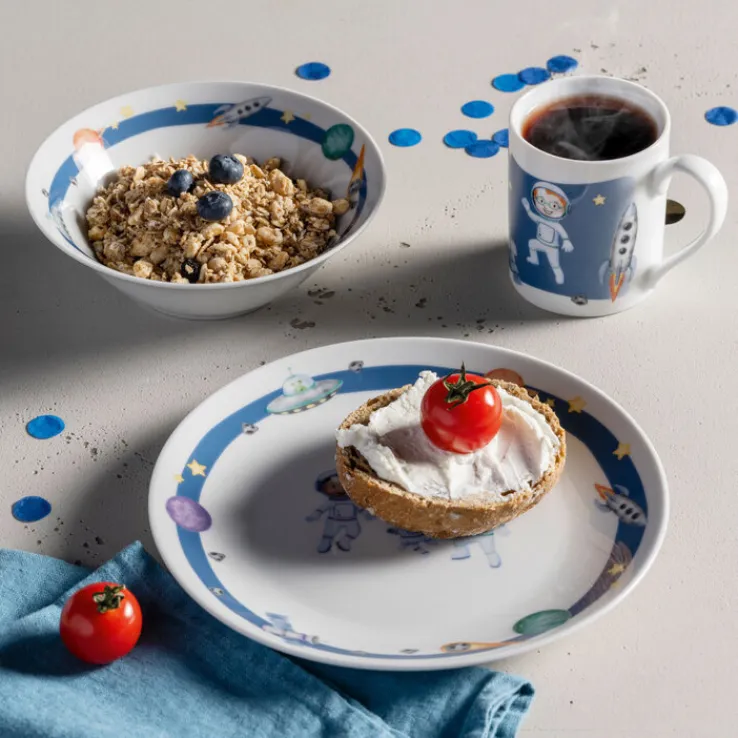 Das LEONARDO Kindergeschirrset BAMBINI AVVENTURA besteht aus einer Tasse, einem flachen Teller und einer Schale. Hergestellt aus hochwertigem, weißen Porzellan sind die Geschirrteile mikrowellengeeignet sowie spülmaschinenfest. Dadurch ist das Kindergeschirr auch für die tägliche Verwendung im Alltag hervorragende geeignet. Das Highlight des Sets ist jedoch die bezaubernde Optik. Mit seinen Weltraum-Motiven spricht das Kindergeschirr Mädchen und Jungen an und eignet sich als Geschenk für jeden Anlass.