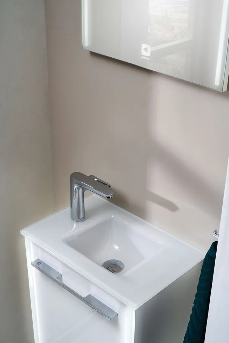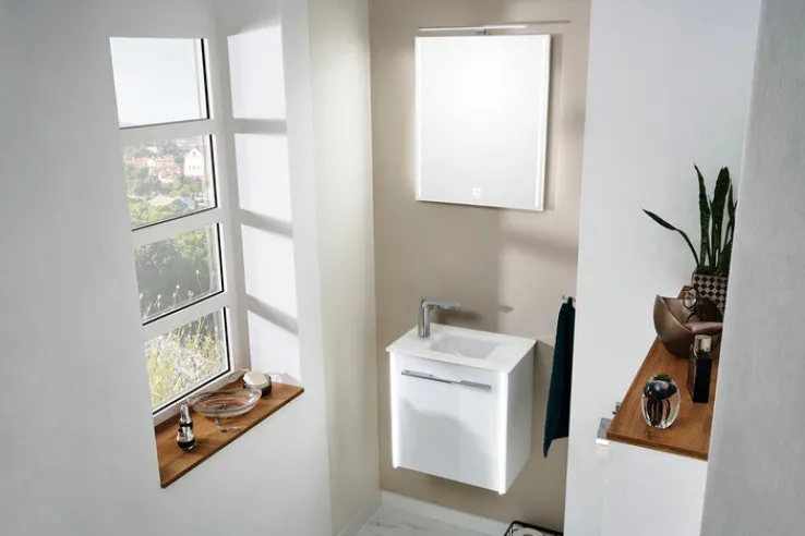 Der LEONARDO Waschplatz ist eine stilvolle Lösung, wenn nur wenig Platz zur Verfügung steht. Durch seine Hochglanzoptik und helle Farbgebung lässt der Unterschrank zur Wandmontage kleine Badezimmer größer wirken. Hinter der Drehtür befindet sich Platz zum Verstauen von Toilettenartikeln wie Gästehandtücher, Reinigungs- oder Pflegeprodukte. Das puristische Design von Waschbecken und Unterschrank ergibt ein stimmiges Erscheinungsbild und erzeugt eine moderne Atmosphäre. Perfekt zur Geltung kommt der Waschplatz mit dem Flächenspiegel der LEONARDO-Kollektion.