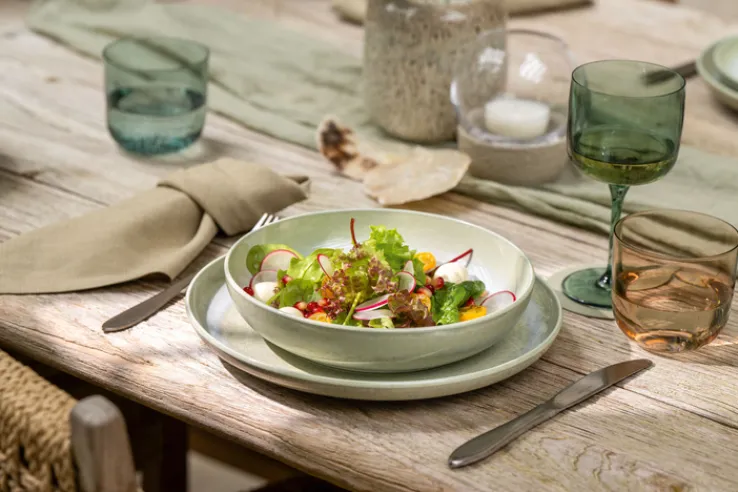 Erdige Farben sind eines der Merkmale des Boho-Stils, zu dem dieser Teller gerechnet wird. Er wirkt unkonventionell und doch zeitlos. Seine Farben zeigen keine ganz korrekte Trennung, was für einige Lebendigkeit sorgt, ohne unruhig zu wirken. Aus dieser Schale schmeckt Pasta besonders gut, vor allem, wenn viel Soße dabei ist, die hier nicht wegrutschen kann. Aber auch eine gute Portion Salat passt hervorragend auf diesen Teller.
