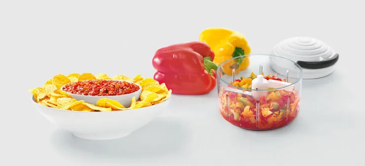 Der hochwertige Zerkleinerer ist aus stabilem Kunststoff gefertigt. Die scharfen Klingen sind aus säurefestem, geschmacksneutralem und lebensmittelechtem Edelstahl hergestellt. Alle Teile des Multi-Zerkleinerers sind einfach von Hand oder in der Spülmaschine zu reinigen.