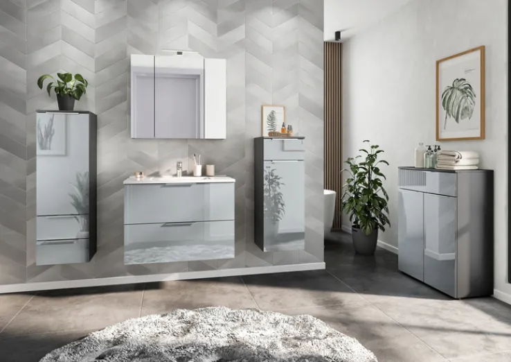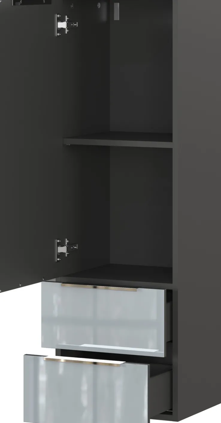 Bevor im Bad Chaos herrscht, sorgt der 36 x 111 x 34 cm große Midischrank JAN in Graphit/Silbergrau im Handumdrehen für Ordnung. Kein Wunder: Hinter der Drehtür und in den beiden Schubkästen ist richtig viel Platz!