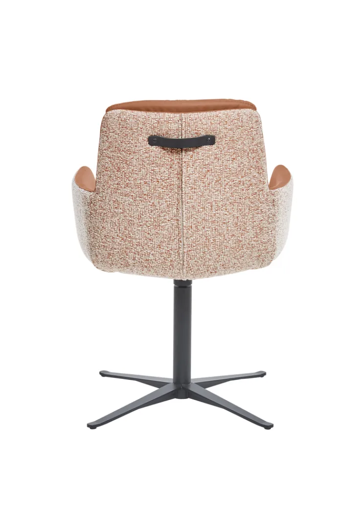MADINA von Ole Gunderson zeigt sich außen mit einem wunderschönen Flachgewebe in Donna Rusty Melange und innen in Cloud Brandy. Der Armlehnstuhl ist gepolstert und besitzt einen drehbaren Viersternfuß aus mattem schwarzem Metall. Außerdem verfügt MADINA über einen aparten Ledergriff. Mit einer Breite von 63 cm, einer Höhe von 90 cm und einer Tiefe 66 cm macht sich der Armlehnstuhl im heimischen Arbeitszimmer ebenso gut wie im Wohnzimmer. Die Armlehnen sind fest und tragen zu einem hohen Sitzkomfort bei.