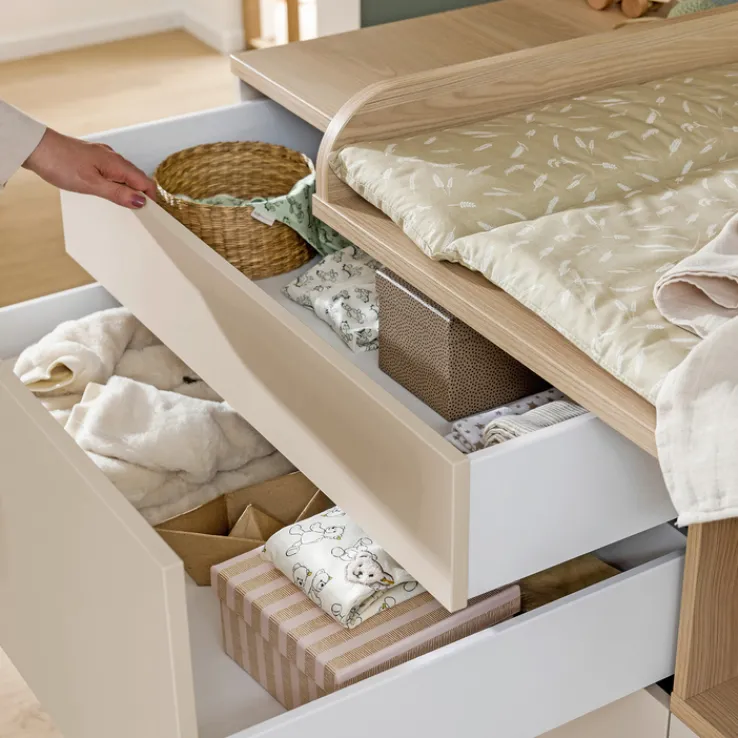 Die vielseitige Wickelkommode MILA & BEN von PAIDI in den attraktiven Farben beige/ braun ist ideal für das modern oder klassisch eingerichtete Baby- und Kinderzimmer. Durch das zeitlose Design ist die schöne Kommode ohne Wickelaufsatz gut mit bereits vorhandenen Möbeln und Einrichtungsgegenständen kombinierbar. Ein Schubkasten mit Vollauszug und große Fächer bieten viel Stauraum für Babykleidung, Windeln und Hygieneartikel. Die eintürige Wickelkommode schafft ein wohnliches Ambiente.