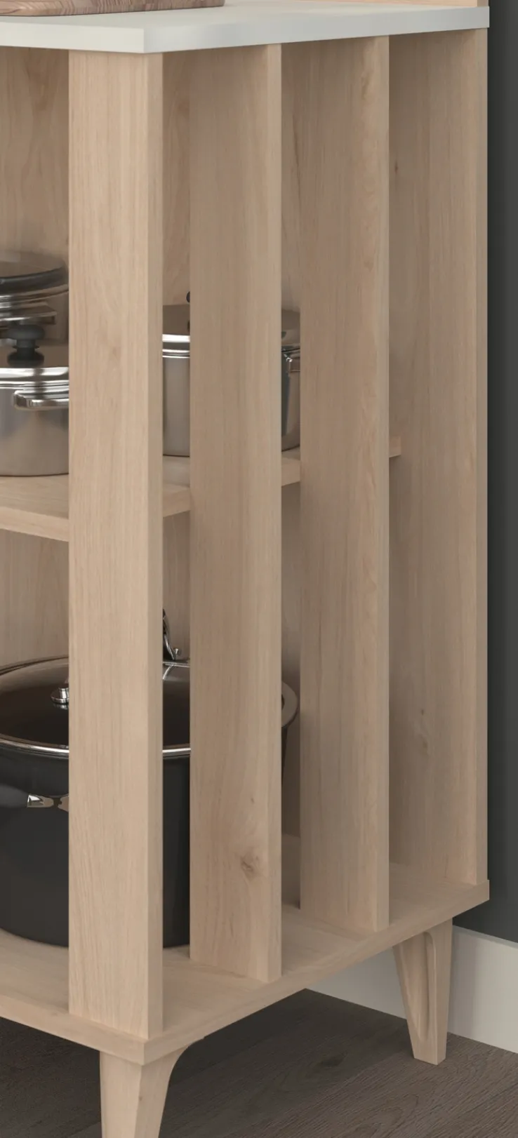 Seinen natürlichen Charme verdankt der Parisot Buffet-Schrank GALA 11 Korpus und Fronten in Jackson Eiche Nachbildung. Die warme Holzfarbe vereint er mit einer Arbeitsplatte in heller Beton-Optik. Durch den stylischen Kontrast und dekorativer Claustra an der Seite zieht das Buffet alle Blicke auf sich. Hinter den zwei Drehtüren und im Schubkasten wartet der Schrank mit staub- und sichtgeschütztem Stauraum auf, während die offenen Fächer häufig genutzte Küchenutensilien aufnehmen.