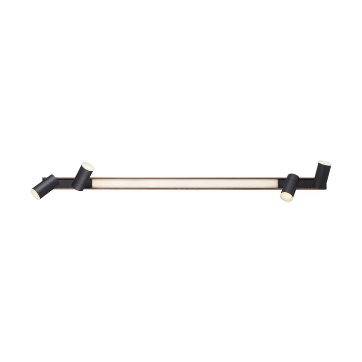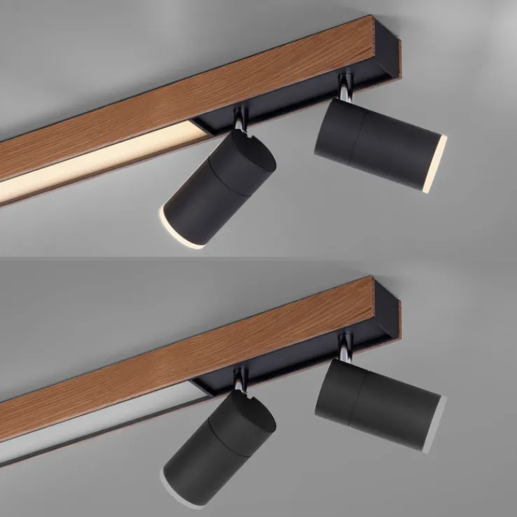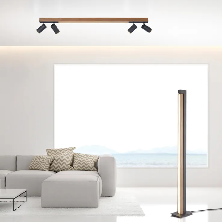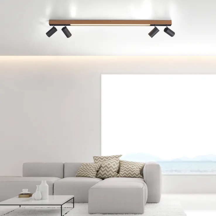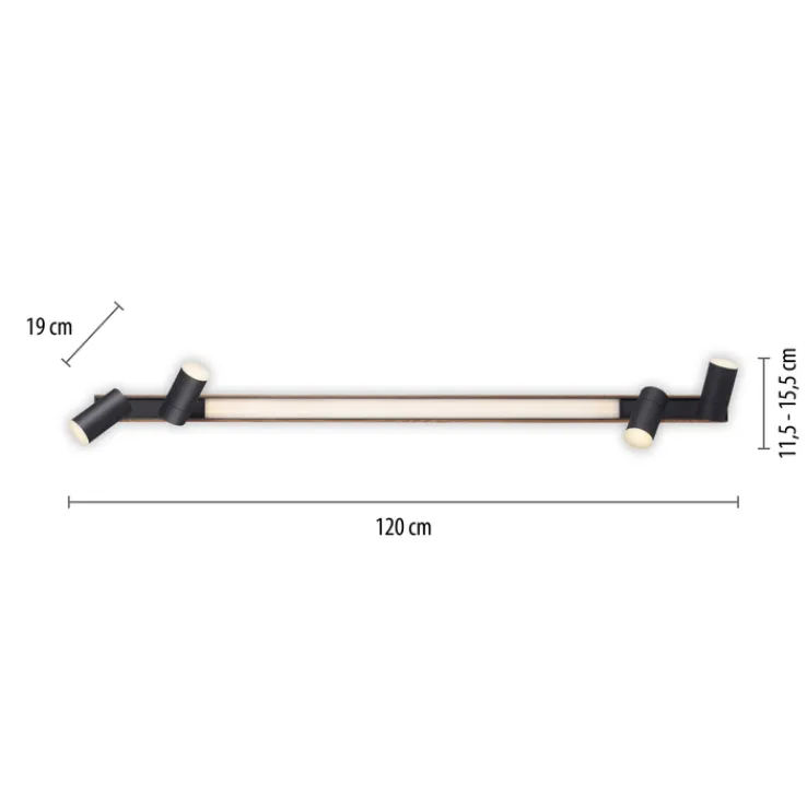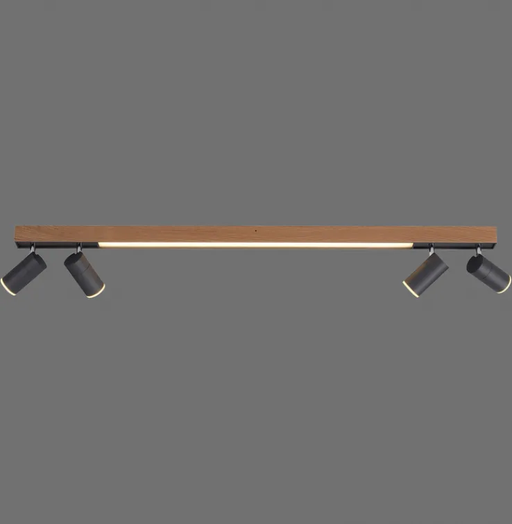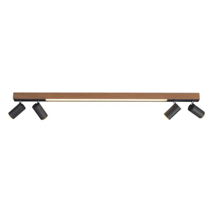 Die LED Deckenlampe PURE-LINES 5-flg ist braunfarbig und besteht aus Holz sowie aus Metall. Sie ist 19 cm breit und 120 cm tief und vereint eine leuchtstarke Deckenlampe mit einem praktischen 4-fach Spotlight.