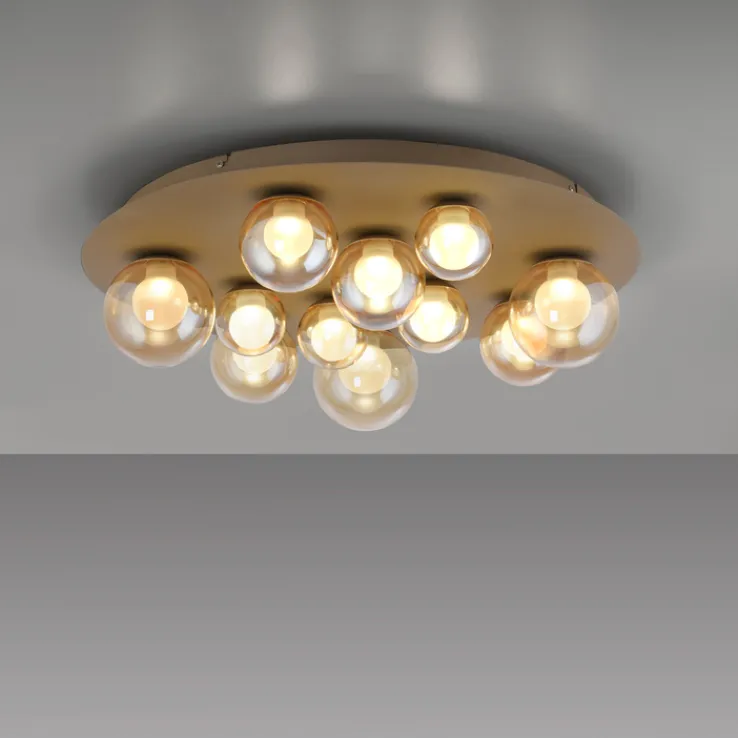 Die LED Deckenlampe im Japandi-Stil kombiniert eine runde Form mit einer hochwertigen Verarbeitung aus Aluminium und Rauchglas. Die Oberfläche zeigt eine goldfarbige, leicht bronzefarbene Optik, die zusammen mit den elf rauchfarbenen Glaskugeln ein harmonisches, modernes Gesamtbild erzeugt. Die Glaskörper sind in unterschiedlichen Größen angeordnet und sorgen für ein interessantes Lichtspiel sowie eine sanfte Lichtverteilung. Die Konstruktion wirkt solide und eignet sich durch ihre dezente Farbgestaltung für verschiedene Wohnbereiche, darunter Wohnzimmer, Schlafzimmer, Küche, Flur und Arbeitszimmer.
