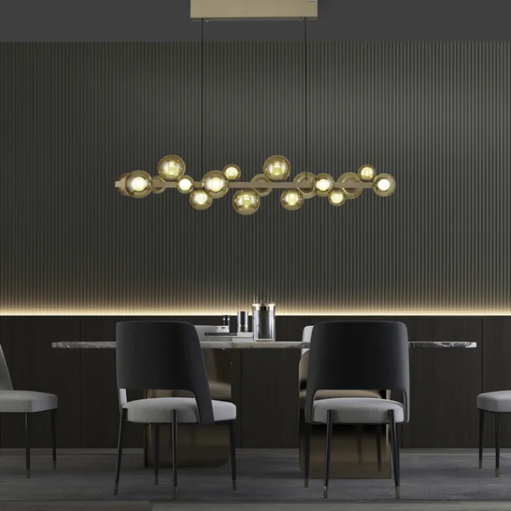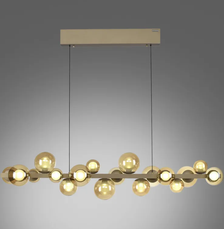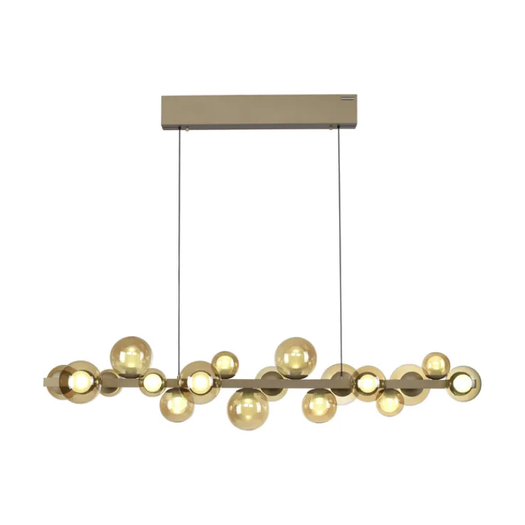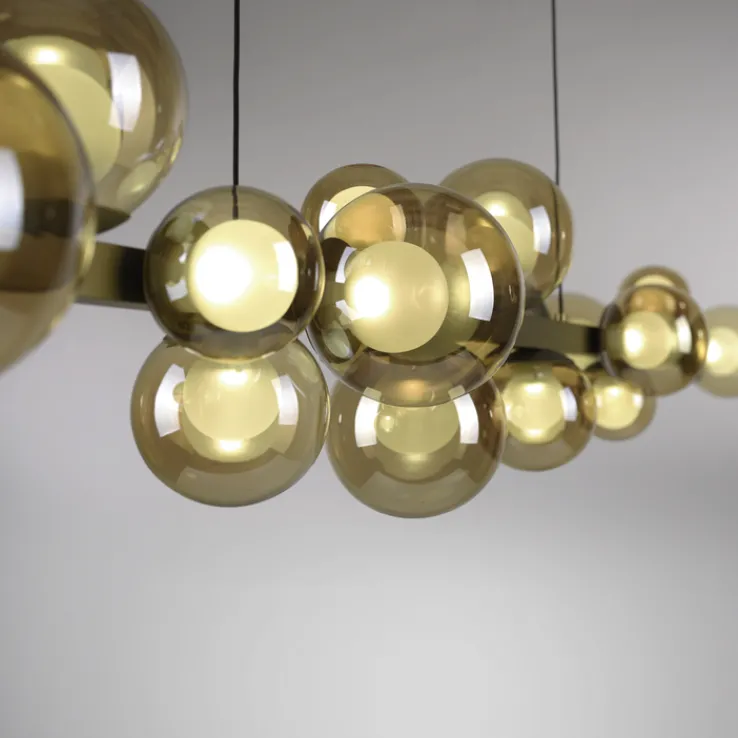 Die LED Pendelleuchte E-POPUP besteht aus 18 Glaskugeln, von denen die größeren amberfarbig getönt und die kleineren satiniert sind. In jeder Kugel befindet sich eine 1,8 Watt starke, fest eingebaute LED. Mit zusammen rund 32 Watt erreichen die LEDs eine Lichtleistung von 3.888 Lumen. Die Helligkeit ist dimmbar und die Farbtemperatur von 2.700 bis 5.000 Kelvin (Warmweiß bis Neutralweiß) justierbar. Eine Memory-Funktion ist vorhanden. Außerdem verfügt die Hängelampe über einen E-Lift(R)-Antrieb, der eine Einstellung der Höhe zwischen 45 und 240 cm erlaubt.
