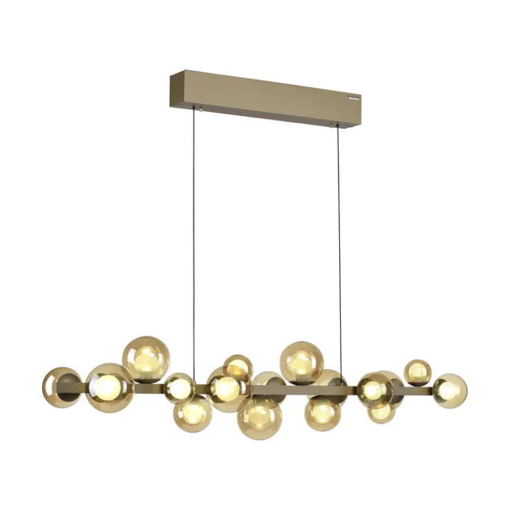 Die 120 cm tiefe LED Pendelleuchte E-POPUP ist messing- beziehungsweise braunfarbig sowie aus Glas und Metall gefertigt. Sie ist über eine stufenlos einstellbare Fernbedienung bedienbar und elektrisch höhenverstellbar.