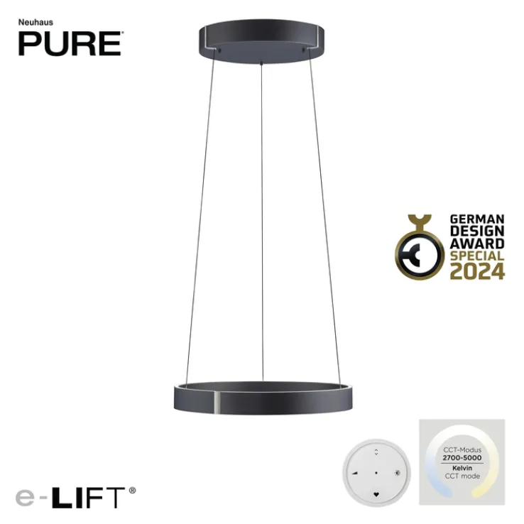 Der Hersteller Paul Neuhaus setzt bei dieser Hängeleuchte mit zwei fest eingebauten LED-Leuchtmitteln je 20 Watt konsequent auf Flexibilität und einen hohen Bedienkomfort. Ein innovativer E-Lift-Antrieb ermöglicht es, die Höhe des flachen Lampenschirms zwischen 40 und 350 cm zu variieren. Per Fernbedienung lässt sich in einer Bandbreite zwischen 2.700 und 5.000 Kelvin auch die Farbtemperatur individuell bestimmen. Dasselbe gilt für die Lichthelligkeit, deren Maximalwert bei 4.800 Lumen liegt. Erwähnung verdient auch die praktische Memory-Funktion der PURE E-CLIPSE.